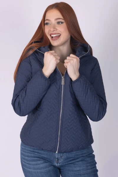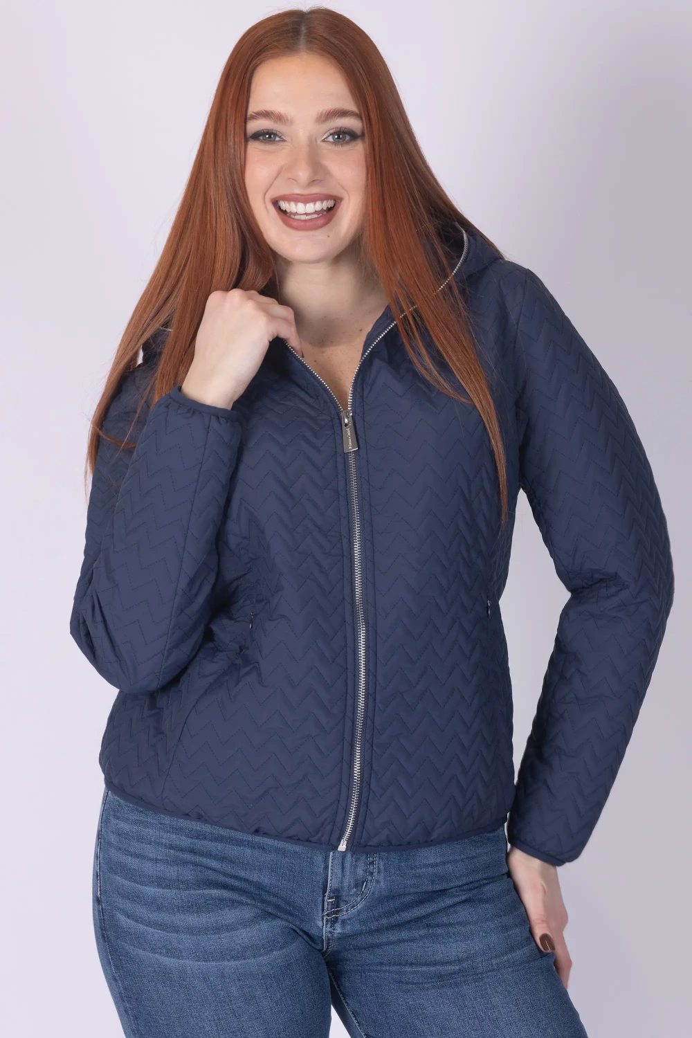 Giubbotto caratterizzato da motivo zig zag che dona al capo un effetto grafico originale. Il modello è dotato di cappuccio e chiusura frontale con zip, dettagli pratici che completano il design.