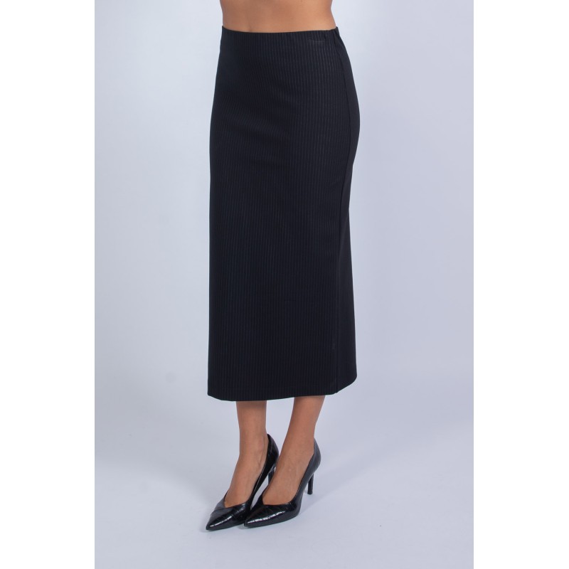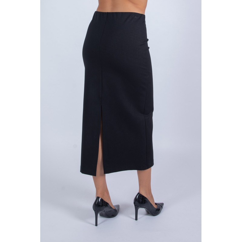 Dai un tocco di classe al tuo guardaroba con questa gonna longuette in raffinato tessuto punto Milano gessato. La linea aderente valorizza la silhouette, mentre lo spacco sul retro aggiunge femminilità e praticità nei movimenti. L'elastico in vita garantisce comfort e una vestibilità perfetta, senza rinunciare allo stile. Perfetta da indossare con un blazer o una camicia per un look da ufficio moderno e sofisticato. Aggiungila ora al tuo carrello e crea outfit versatili e senza tempo! 65% viscosa 30% nylon 5% elastan