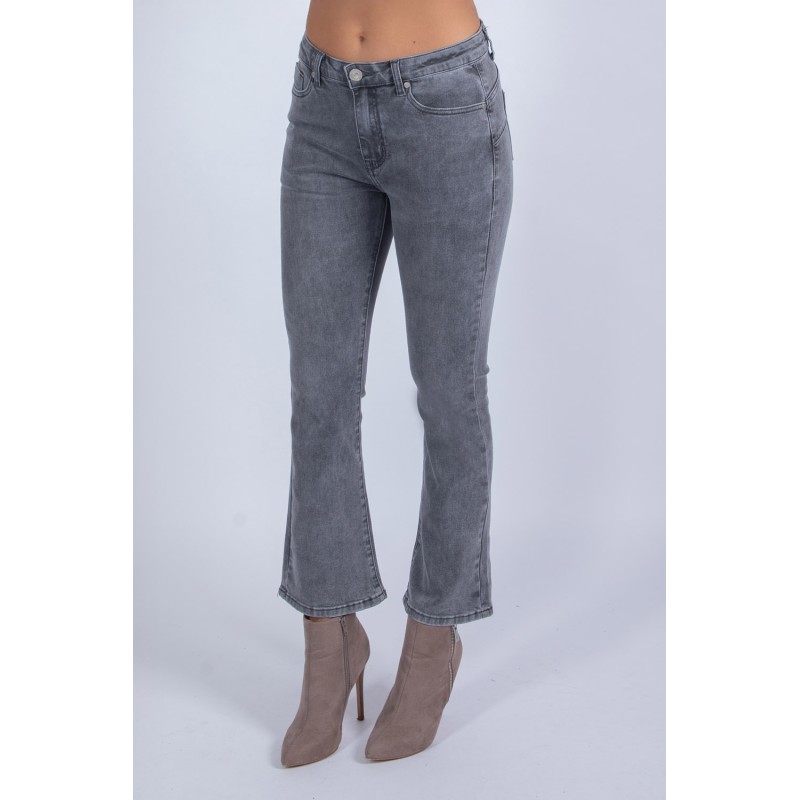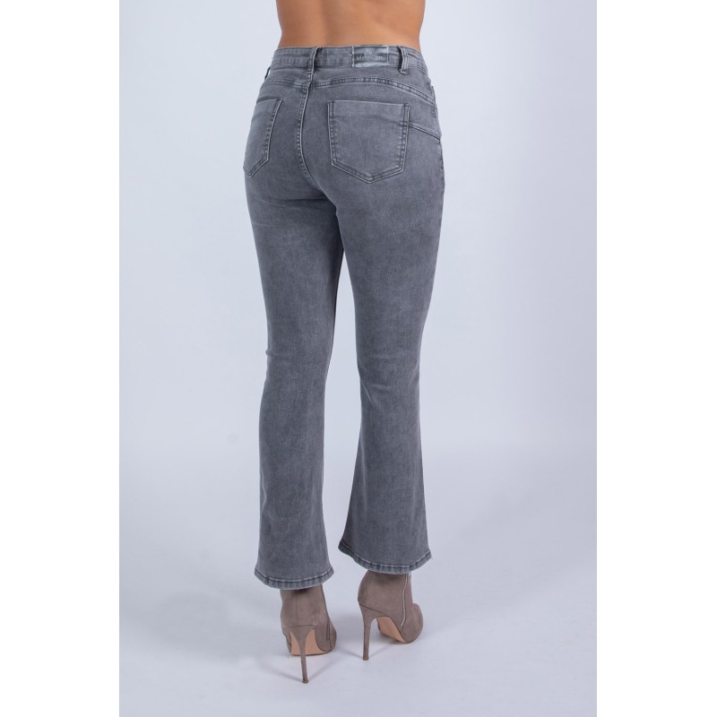Jeans grigio a vita alta con modello cinque tasche e gamba a zampa, realizzati in tessuto elasticizzato per garantire comfort e libertà di movimento. Perfetti per chi vuole un look moderno e femminile con un tocco di praticità. Non perdere l'occasione di aggiungerli al tuo guardaroba! 73% cotone 25% poliestere 2% elastan