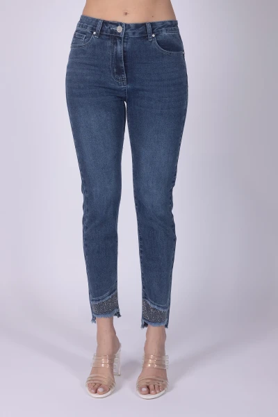 Jeans modello sigaretta caratterizzato da fondo irregolare sfrangiato, un dettaglio che dona al capo un aspetto grintoso e attuale. Il design è arricchito da strass applicati, elementi luminosi che impreziosiscono il denim con un tocco ricercato.