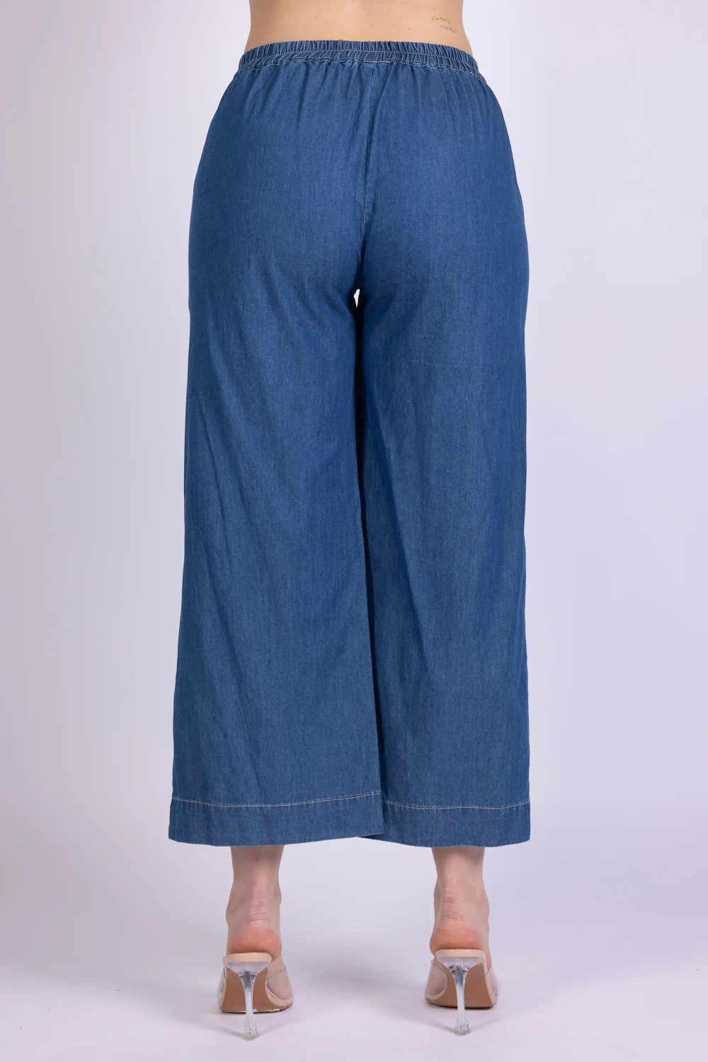 Pantalone cropped in chambray dallo stile leggero e contemporaneo. Il modello presenta elastico sul retro della vita, un dettaglio discreto che favorisce una vestibilità comoda e naturale.