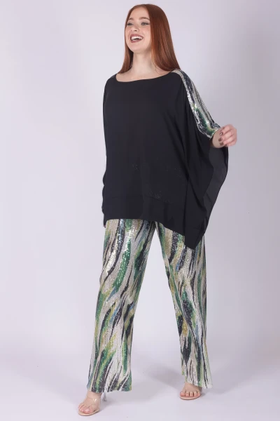 Kaftano in georgette arricchito da paillettes fantasia che donano al capo un effetto luminoso e scenografico. La lavorazione leggera del tessuto esalta il movimento del modello, creando un look ricco di fascino.