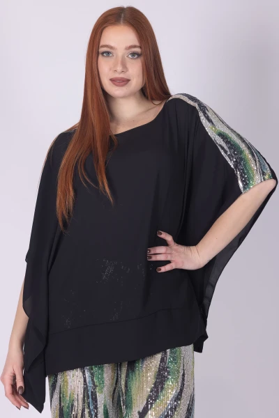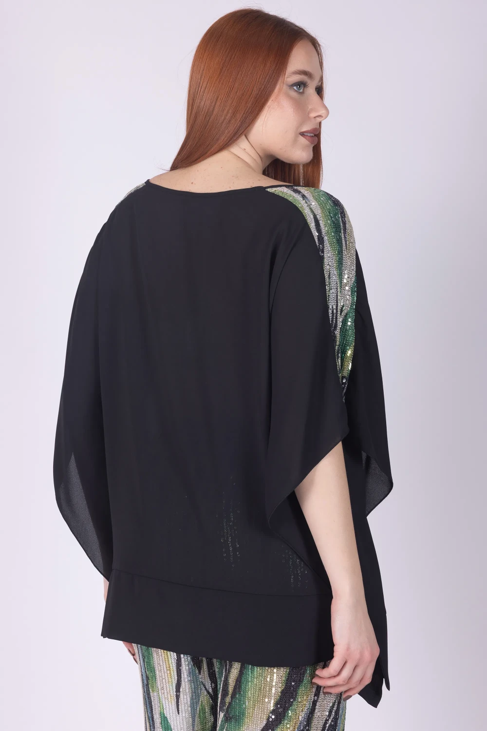 Kaftano in georgette arricchito da paillettes fantasia che donano al capo un effetto luminoso e scenografico. La lavorazione leggera del tessuto esalta il movimento del modello, creando un look ricco di fascino.