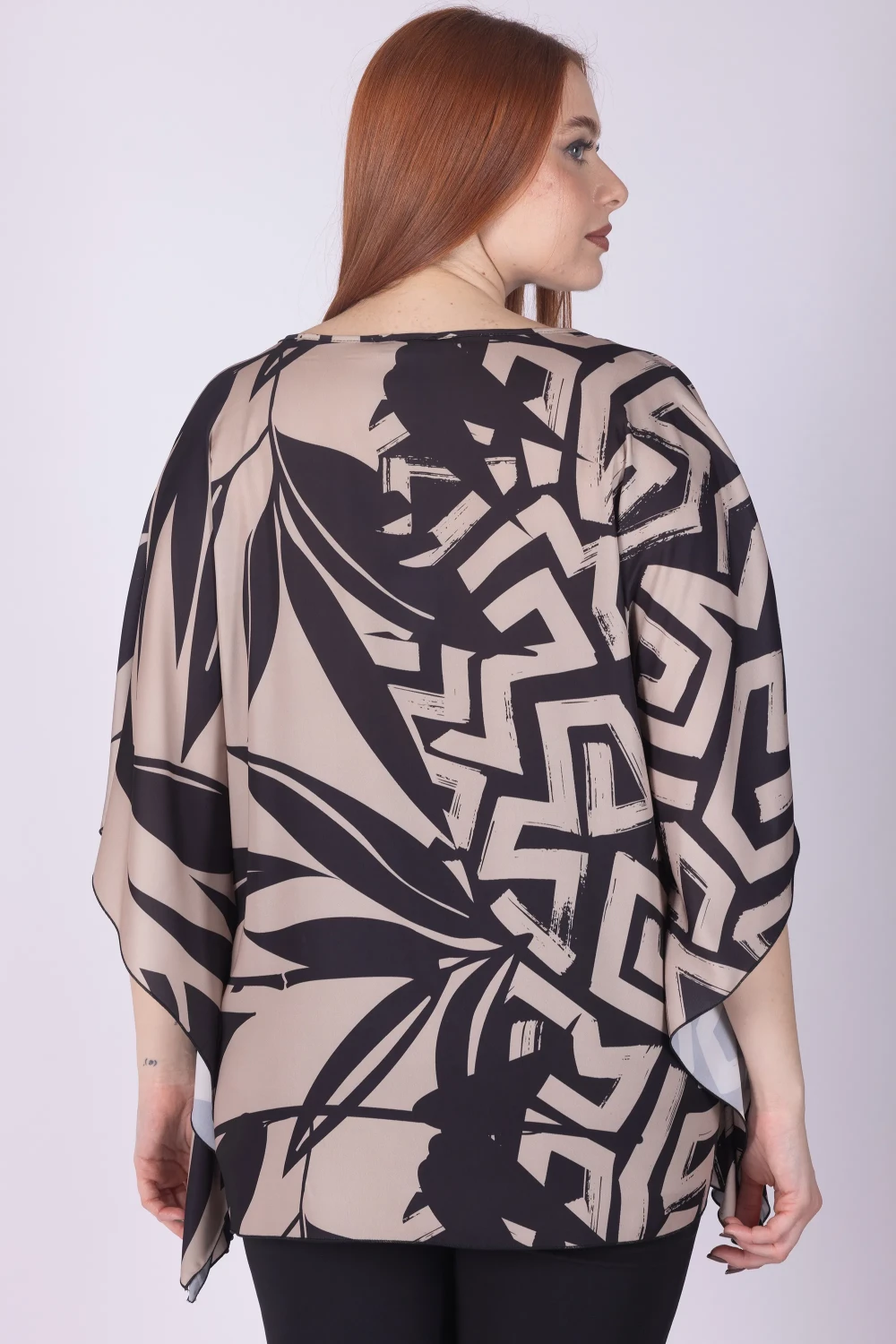 Kaftano fantasia astratta con scollo a V, caratterizzato da una stampa dal forte impatto visivo che dona al capo un aspetto moderno e dinamico.