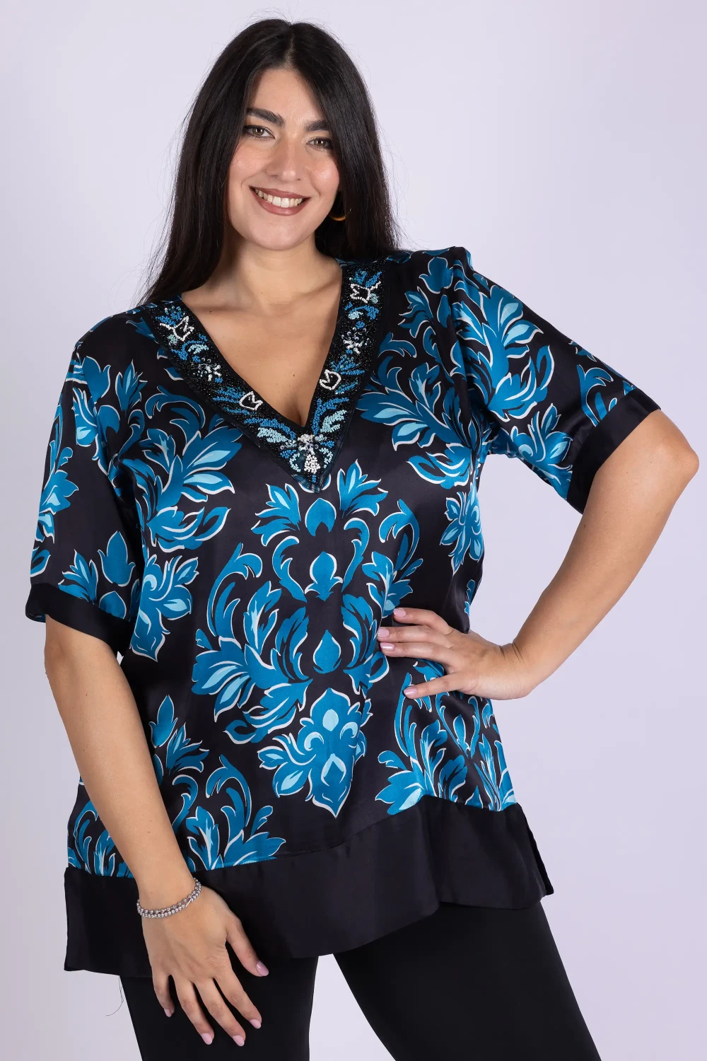 Linee fluide e dettagli ricercati definiscono questo kaftano curvy fantasia, un capo pensato per accompagnare con stile e comfort. Il modello presenta scollo a V e mezza manica, con una vestibilità morbida che segue le forme in modo armonioso.