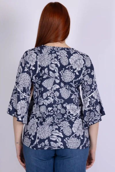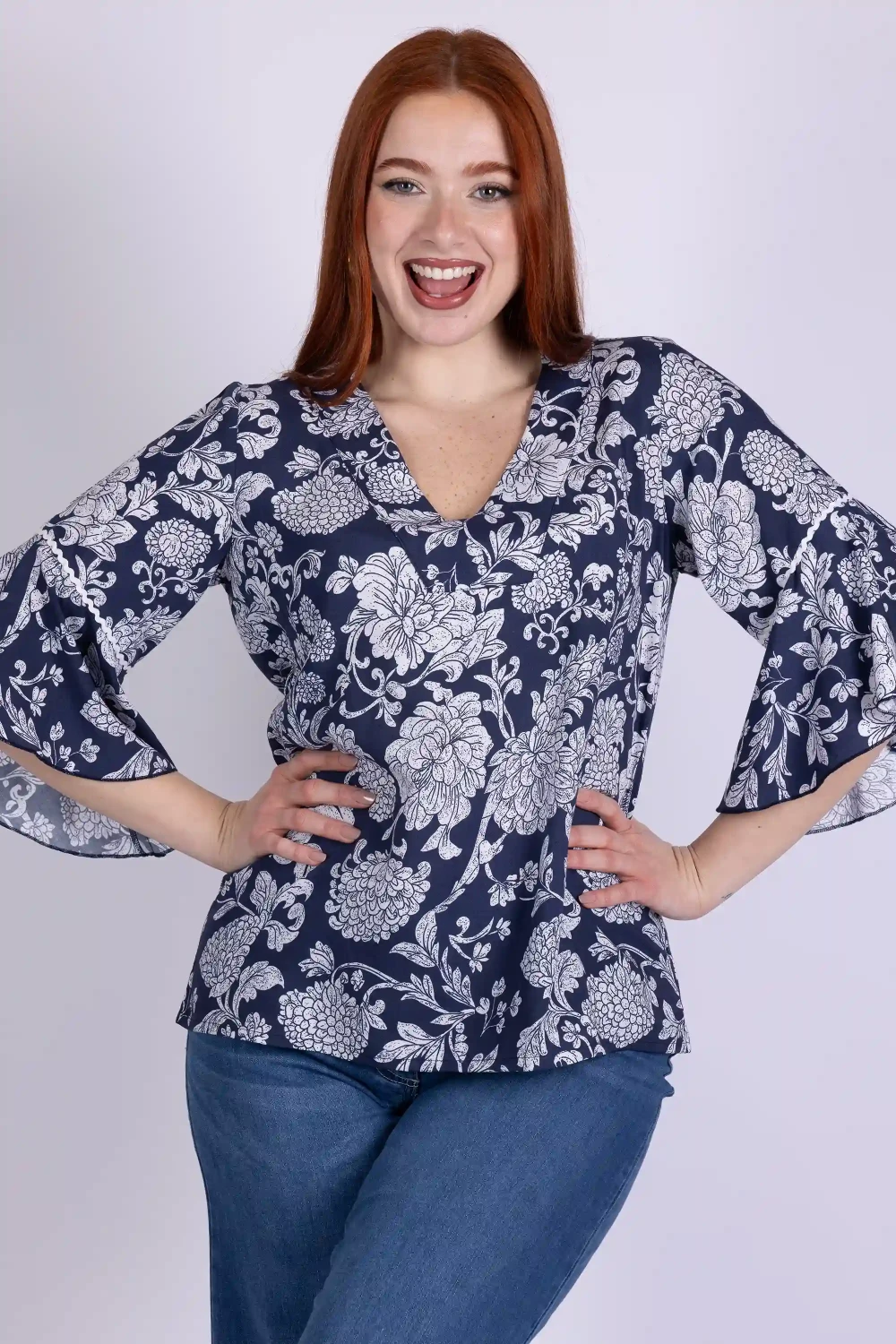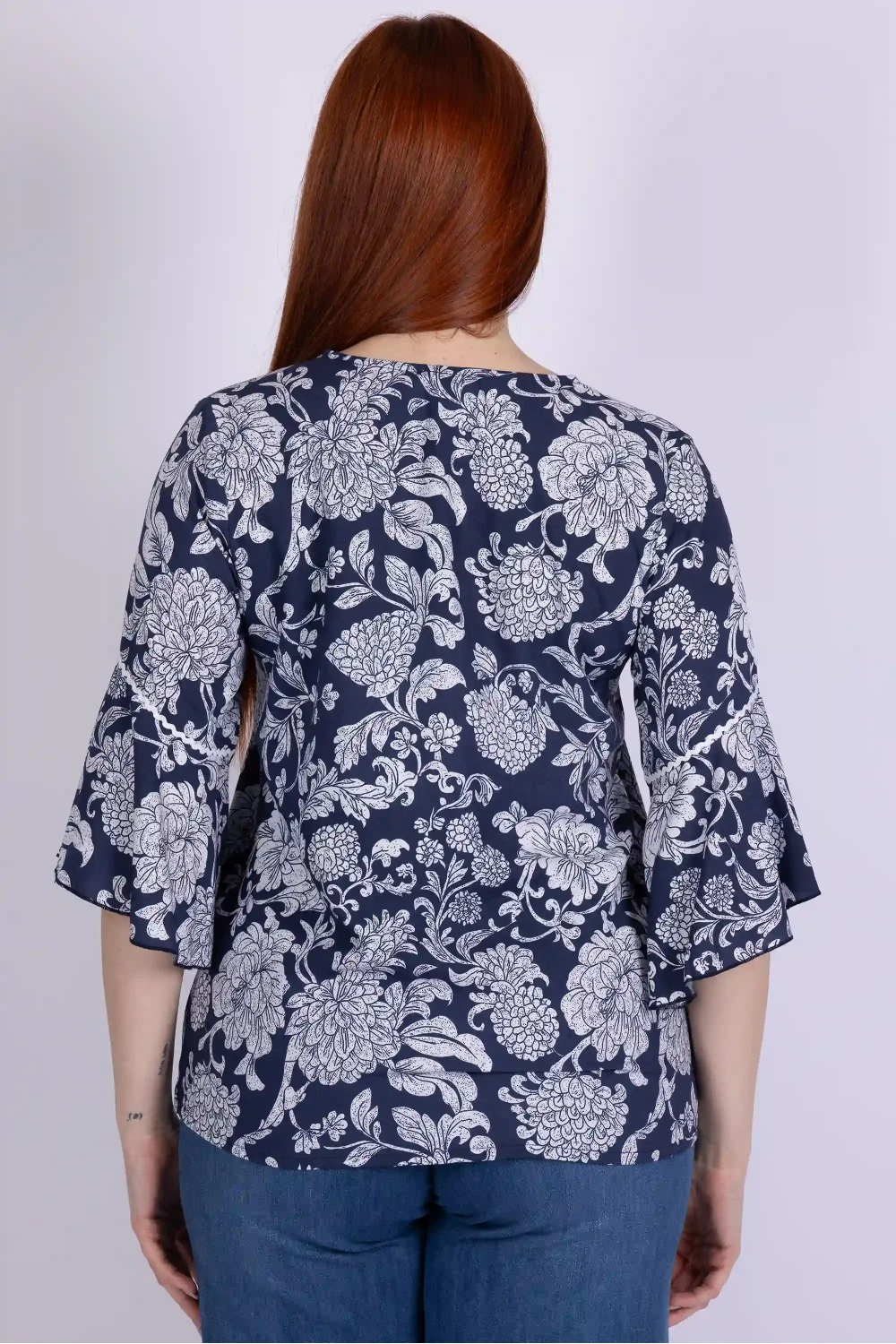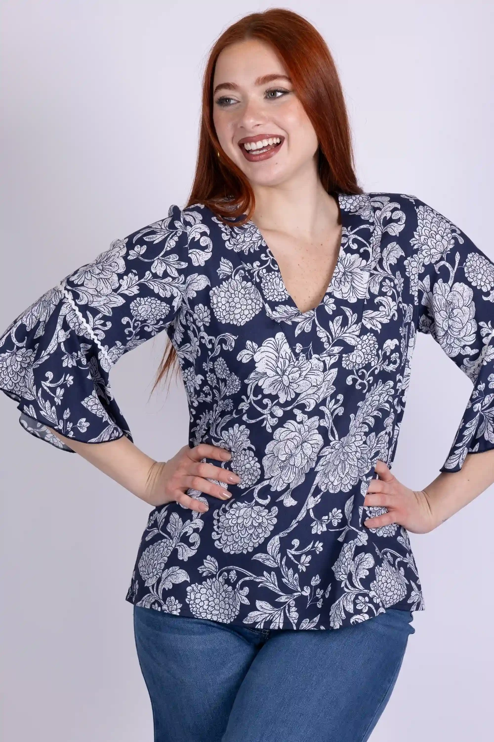 Casacca fantasia floreale con scollo a V, caratterizzata da maniche 3/4 con rouches che aggiungono movimento e valorizzano la linea del capo. Il design è completato da passamaneria sul fondo, dettaglio decorativo che arricchisce il modello.