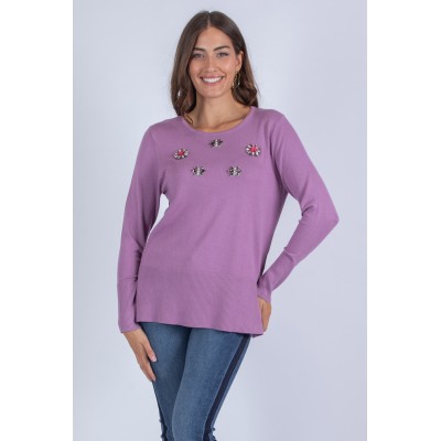 Maglia girocollo elegante, arricchita da spacchi sul fondo che donano movimento e leggerezza al capo. Il vero protagonista è il ricamo di strass gioiello, che impreziosisce delicatamente la maglia, aggiungendo un tocco di brillantezza sofisticata. Perfetta per un look raffinato e luminoso, da indossare sia di giorno che nelle occasioni speciali. Non perdere l'occasione di valorizzare il tuo stile con questo dettaglio prezioso: rendi unica ogni tua giornata! 70% viscosa 20% lana 10% elastan