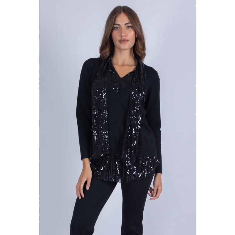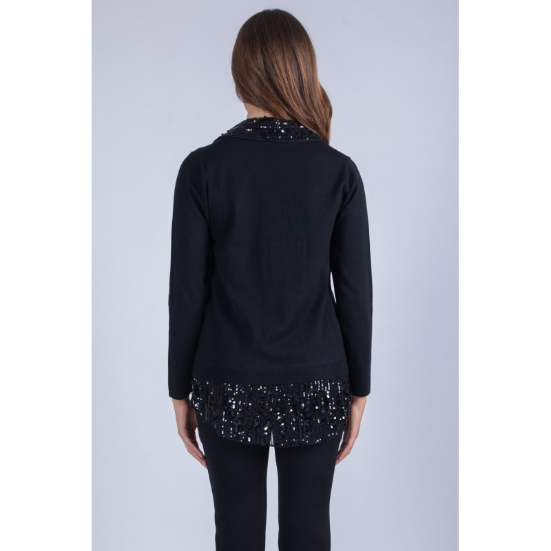 Maglia raffinata con dettaglio in tessuto paillettes effetto finta camicia sul fondo e scollo, per un gioco di texture e lucentezza unico. Realizzata con un mix morbido e confortevole di viscosa, lana ed elastan, assicura una vestibilità elegante e piacevole da indossare. Perfetta per dare un tocco glamour a ogni outfit, questa maglia è ideale per chi ama distinguersi con stile. Non lasciartela sfuggire, aggiungila subito al tuo guardaroba! 70% viscosa 20% lana 10% elastan