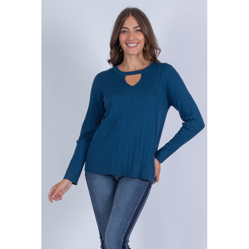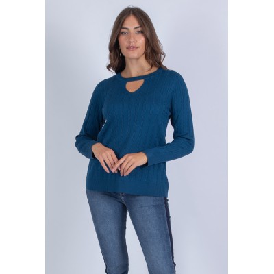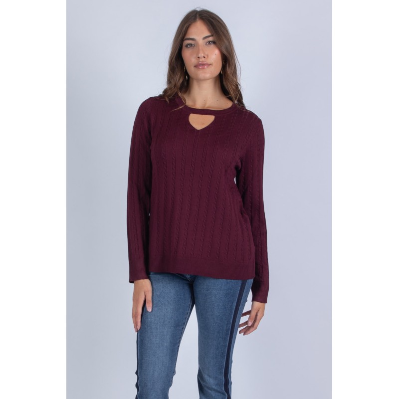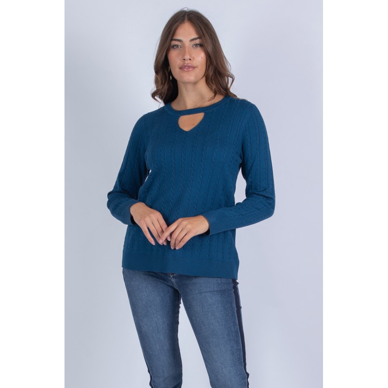 Maglia con elegante lavorazione a trecce e dettaglio cut out sotto lo scollo, per un tocco di stile unico e raffinato. Perfetta da indossare in ogni occasione, unisce comfort e design con un fascino senza tempo. Non lasciartela sfuggire, completa il tuo look con questa maglia irresistibile! 70% viscosa 20% lana 10% elastan