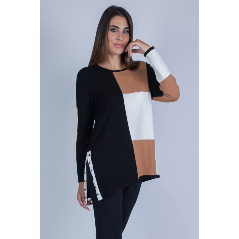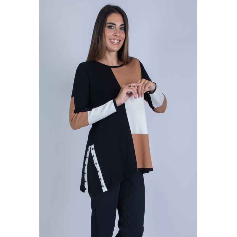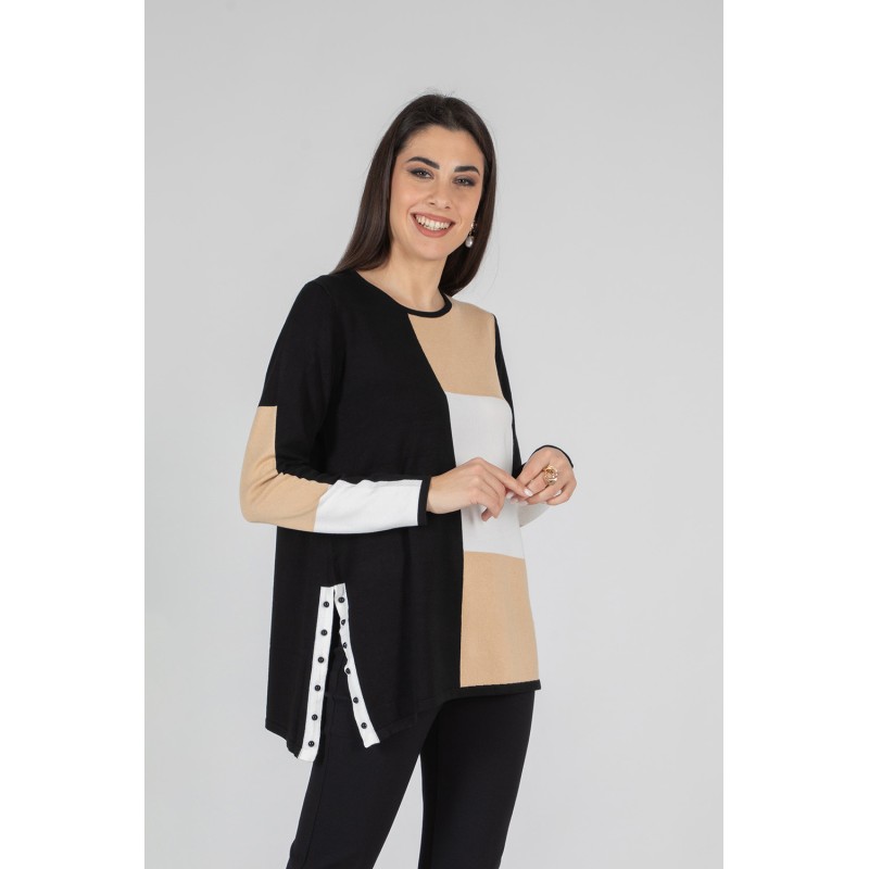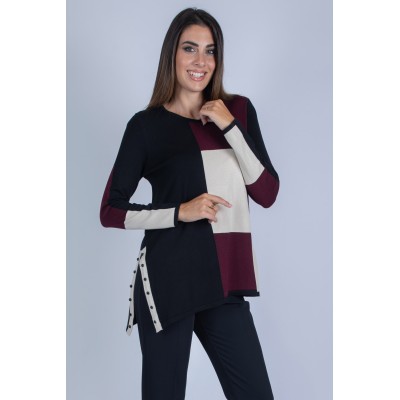 Maxi maglia dal fascino sofisticato, perfetta per le giornate in cui desideri coniugare comfort e stile. Realizzata in morbida maglia con lavorazione jacquard a disegno quadri, presenta uno spacco laterale impreziosito da un delicato inserto di perle che aggiunge luce e raffinatezza. Il fit rilassato e la composizione calda ed elastica la rendono ideale da abbinare a leggings o pantaloni slim per un look contemporaneo e ricercato. 70% viscosa 20% lana 10% elastan