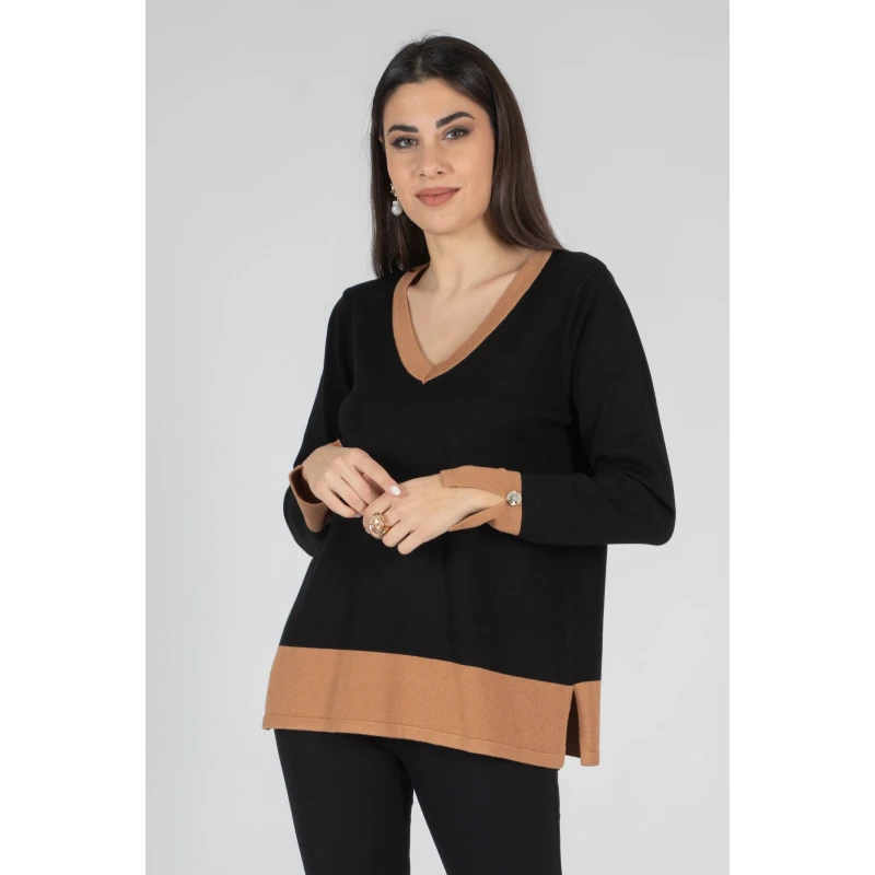 Questa maglia bicolore con scollo a V un capo versatile e raffinato, ideale per chi ama distinguersi con discrezione. I polsini arricchiti da bottoni aggiungono un tocco sartoriale, mentre i delicati spacchetti sul fondo donano movimento e comfort. Il filato morbido e caldo assicura una vestibilità impeccabile per tutto il giorno. Perfetta da sola o sotto un blazer, la maglia che mancava nel tuo guardaroba. Ordinala ora e rinnova i tuoi outfit con un tocco di classe! 70% viscosa 20% lana 10% elastan