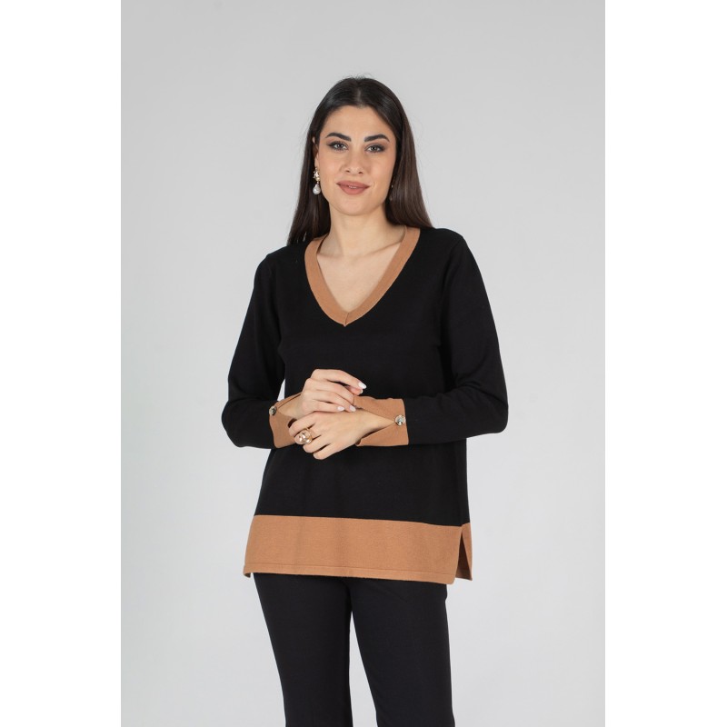 Questa maglia bicolore con scollo a V un capo versatile e raffinato, ideale per chi ama distinguersi con discrezione. I polsini arricchiti da bottoni aggiungono un tocco sartoriale, mentre i delicati spacchetti sul fondo donano movimento e comfort. Il filato morbido e caldo assicura una vestibilità impeccabile per tutto il giorno. Perfetta da sola o sotto un blazer, la maglia che mancava nel tuo guardaroba. Ordinala ora e rinnova i tuoi outfit con un tocco di classe! 70% viscosa 20% lana 10% elastan