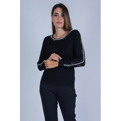 Lasciati conquistare dalla raffinatezza della nostra maglia girocollo a manica lunga, impreziosita da perle ricamate a mano su scollo e maniche per un effetto sofisticato e luminoso. Il mix di viscosa, lana ed elastan garantisce comfort, calore e una vestibilità perfetta, accompagnando ogni tuo movimento con stile. Indossala per valorizzare i tuoi outfit con un dettaglio chic e femminile. Aggiungila ora al carrello e rendi speciale anche il look più semplice! 70% viscosa 20% lana 10% elastan