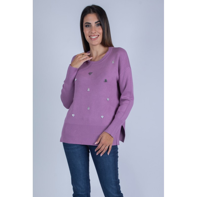 Maglia girocollo tinta unita con spacchetti laterali sul fondo, arricchita da eleganti pendolini frontali con strass ricamati. Un capo luminoso e versatile, ideale per aggiungere un tocco raffinato al tuo look quotidiano. 70% viscosa 20% lana 10% elastan