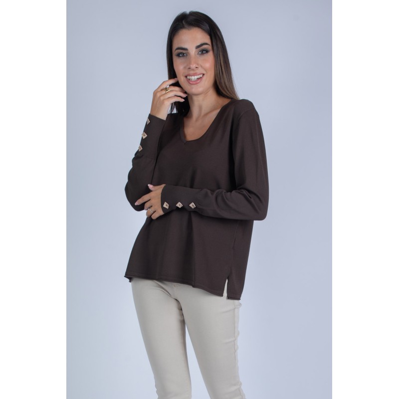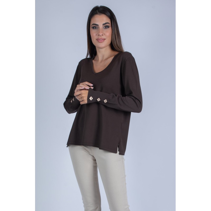 Maglia con scollo a V e maniche a palloncino, arricchite da eleganti bottoni sui polsi. Realizzata in morbida viscosa, unisce femminilità e comfort in un capo versatile e raffinato. Non lasciartela sfuggire: aggiungila subito al tuo guardaroba per un tocco di classe in ogni occasione! 100% viscosa