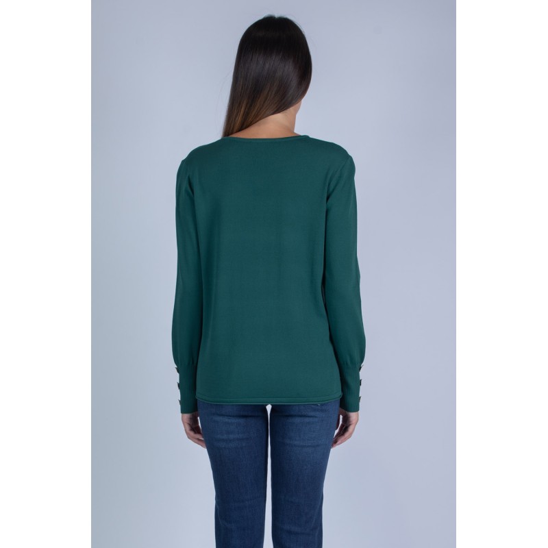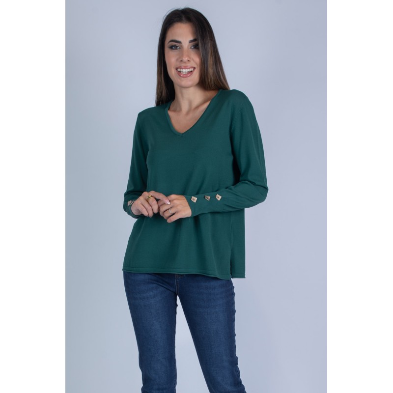 Maglia con scollo a V e maniche a palloncino, arricchite da eleganti bottoni sui polsi. Realizzata in morbida viscosa, unisce femminilità e comfort in un capo versatile e raffinato. Non lasciartela sfuggire: aggiungila subito al tuo guardaroba per un tocco di classe in ogni occasione! 100% viscosa