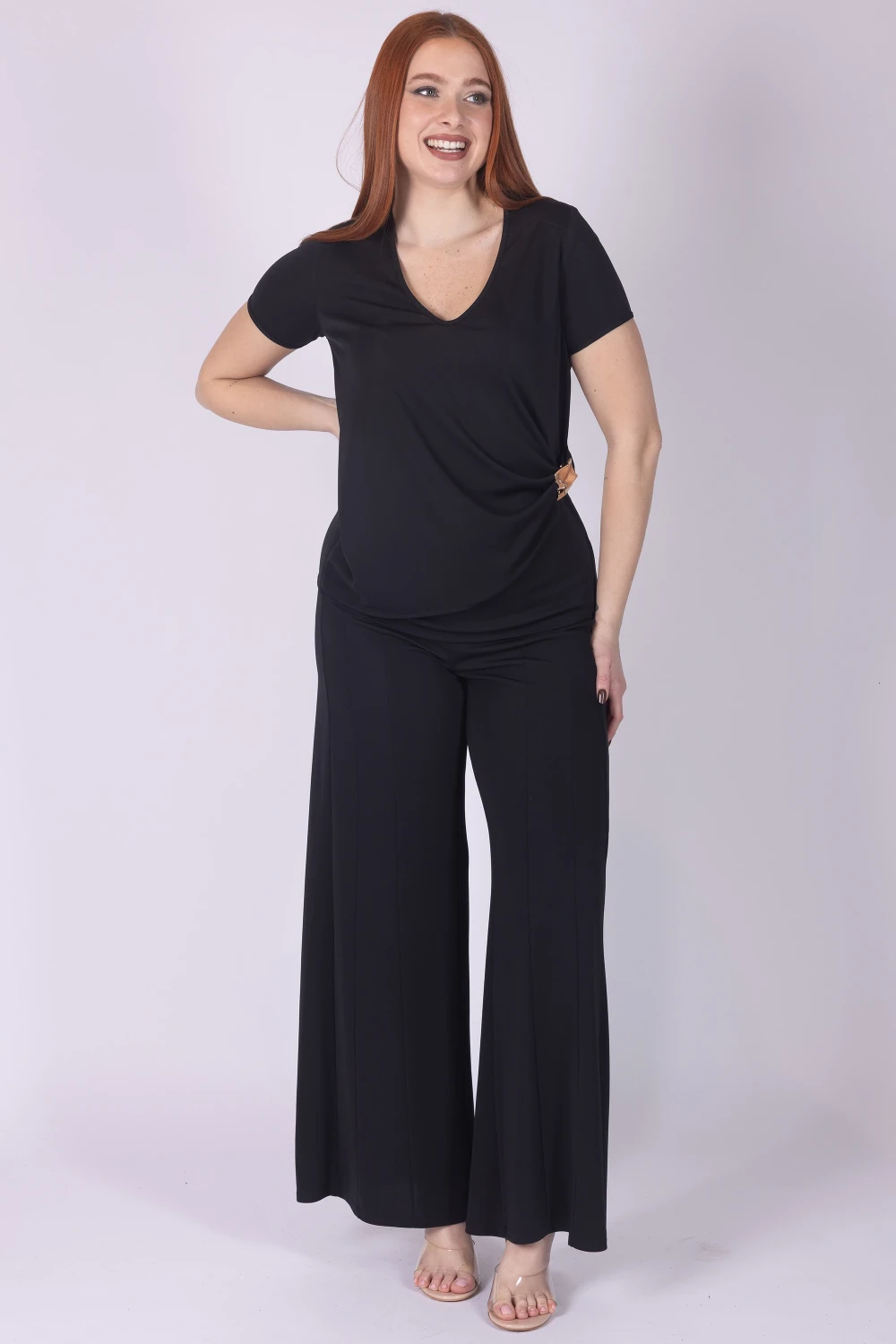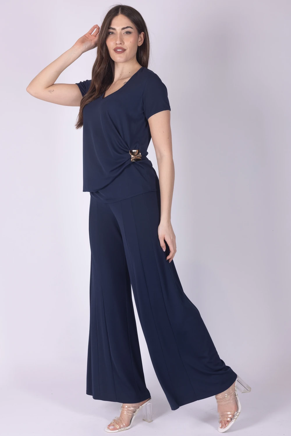 Pantalone palazzo in tessuto fluido, caratterizzato da cuciture frontali che definiscono la linea del capo e aggiungono un dettaglio moderno al design.