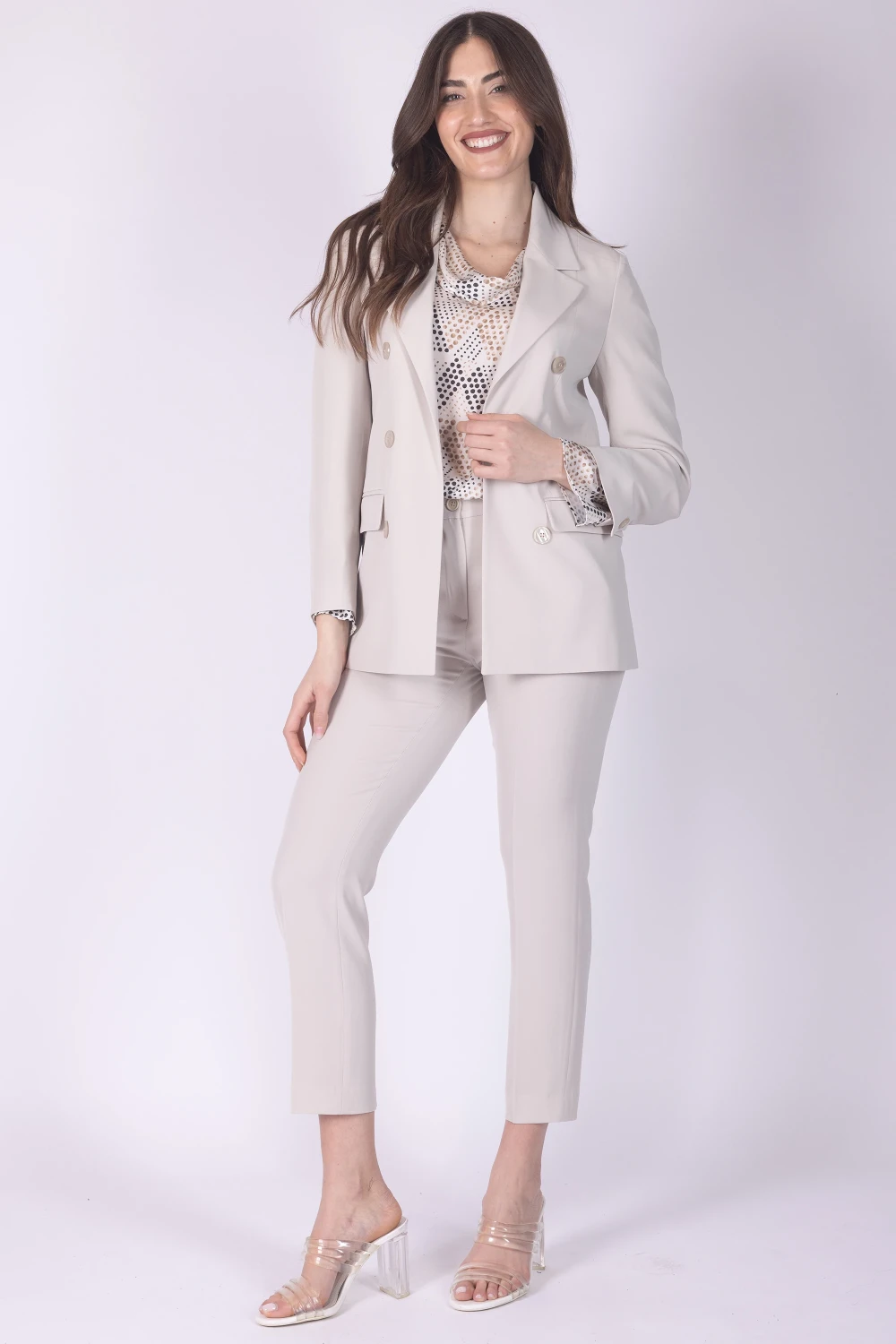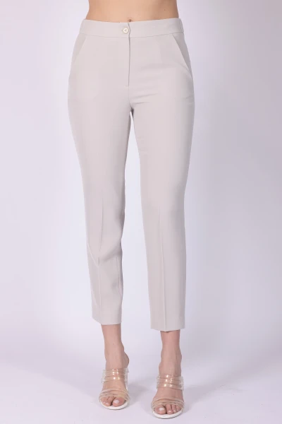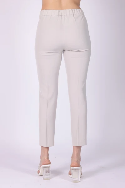 Pantalone modello sigaretta in tessuto fluido, caratterizzato da una linea pulita che dona al capo un aspetto moderno e curato. Il modello presenta elastico sul retro della vita e chiusura con zip e bottone, dettagli che rendono la vestibilità pratica.