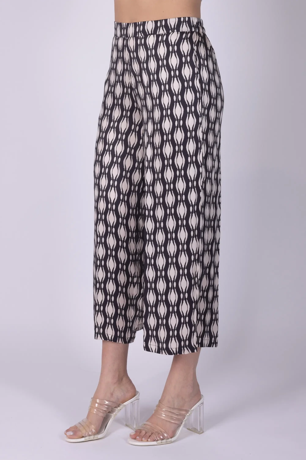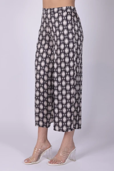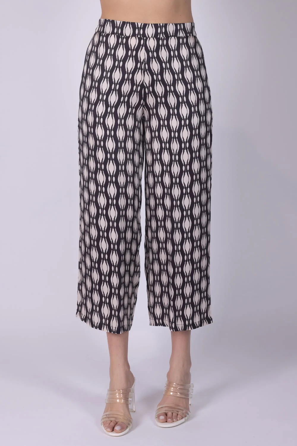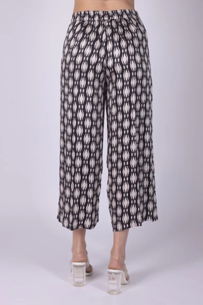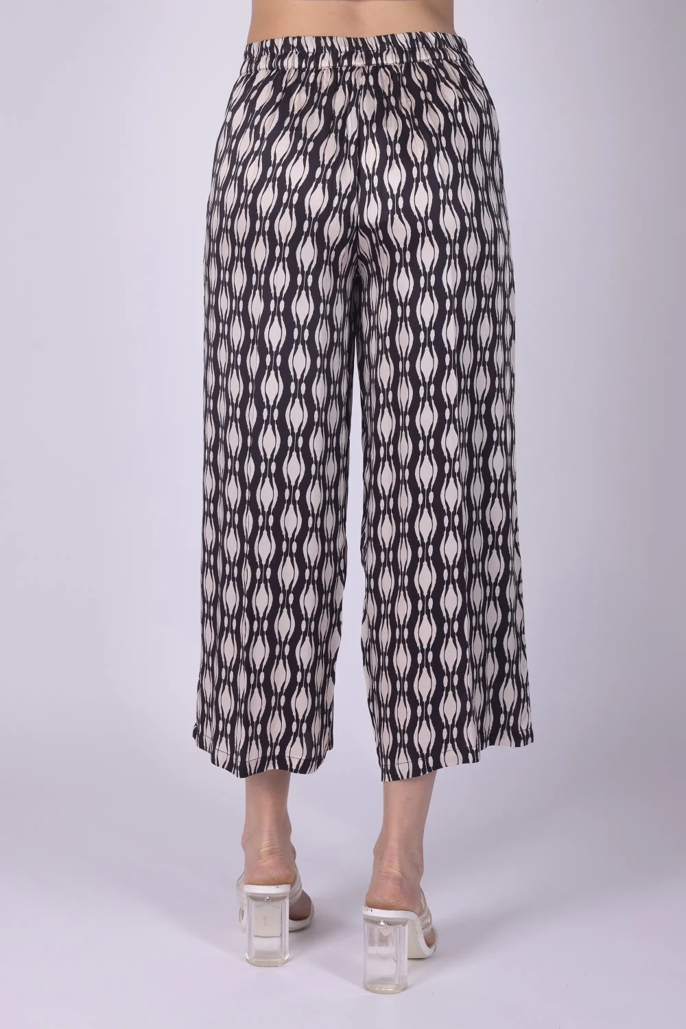 Pantalone cropped in seta fantasia geometrica, caratterizzato da una linea leggera che valorizza la stampa del tessuto. Il modello presenta tasche alla francese e elastico sul retro della vita, dettagli che uniscono praticità e comfort.