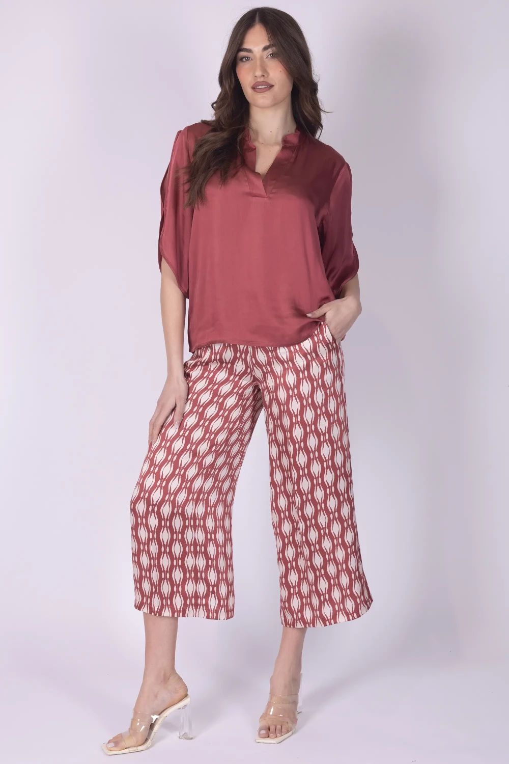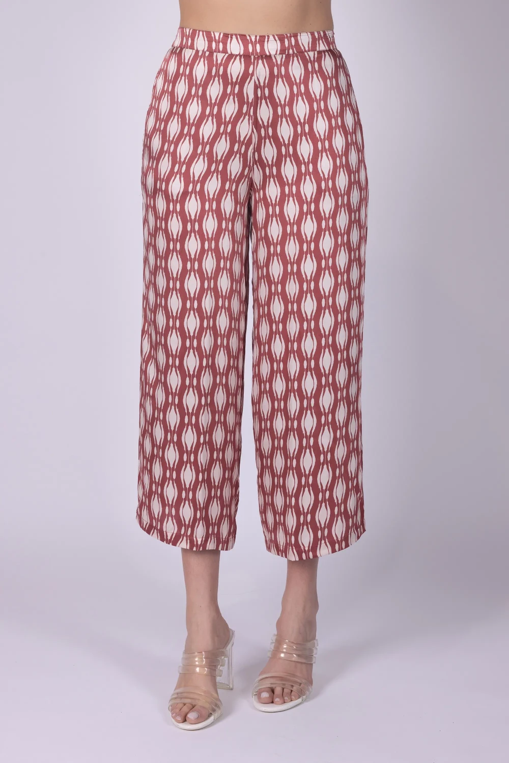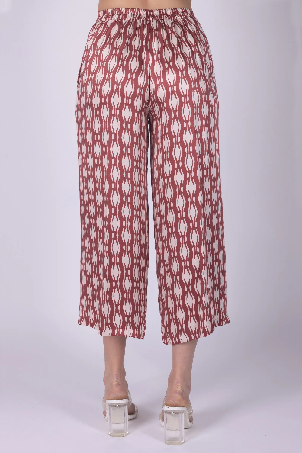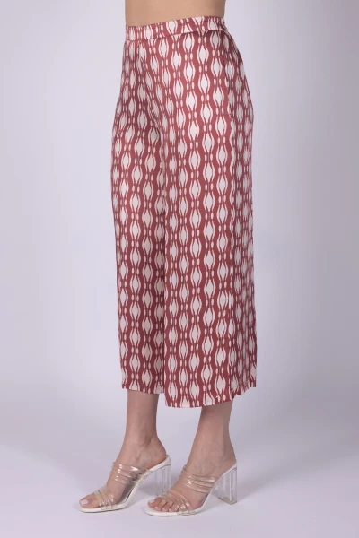 Pantalone cropped in seta fantasia geometrica, caratterizzato da una linea leggera che valorizza la stampa del tessuto. Il modello presenta tasche alla francese e elastico sul retro della vita, dettagli che uniscono praticità e comfort.