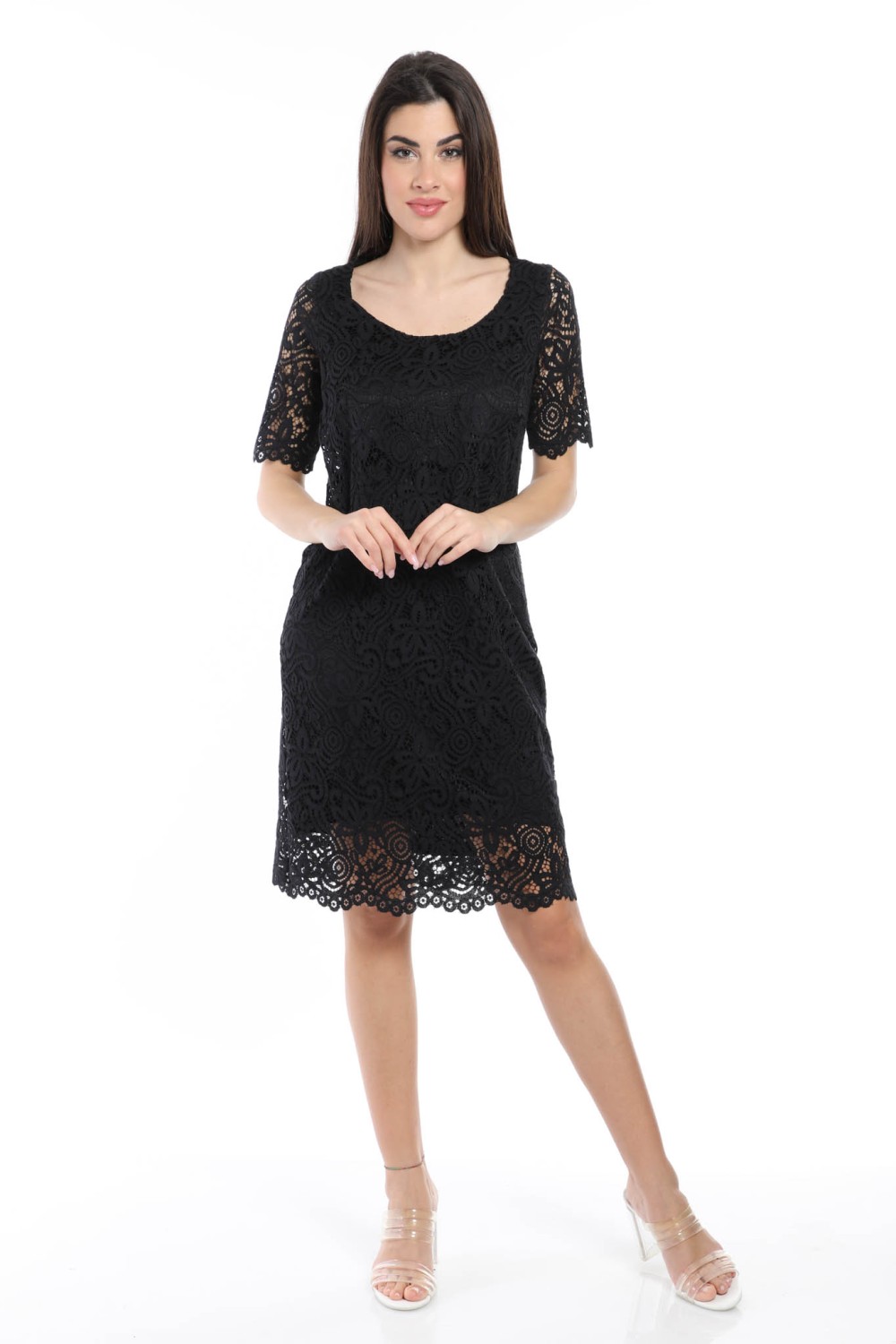 abito mezza manica con pizzo, fodera in raso tono su tono 95% poliestere 5% elastan