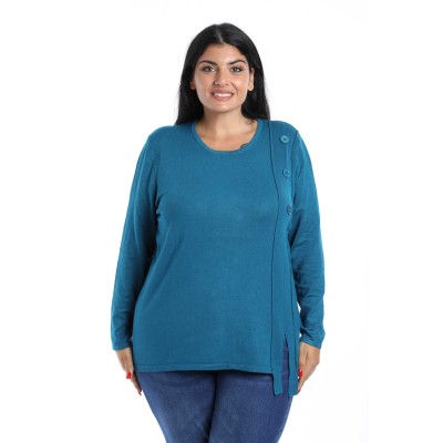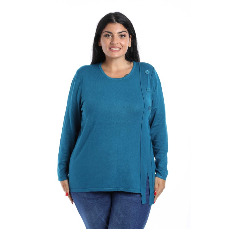 maglia girocollo tinta unita curvy con fascia verticale effetto patchwork tono su tono arricchita da bottoni 70% viscosa 20% lana 10% spandex