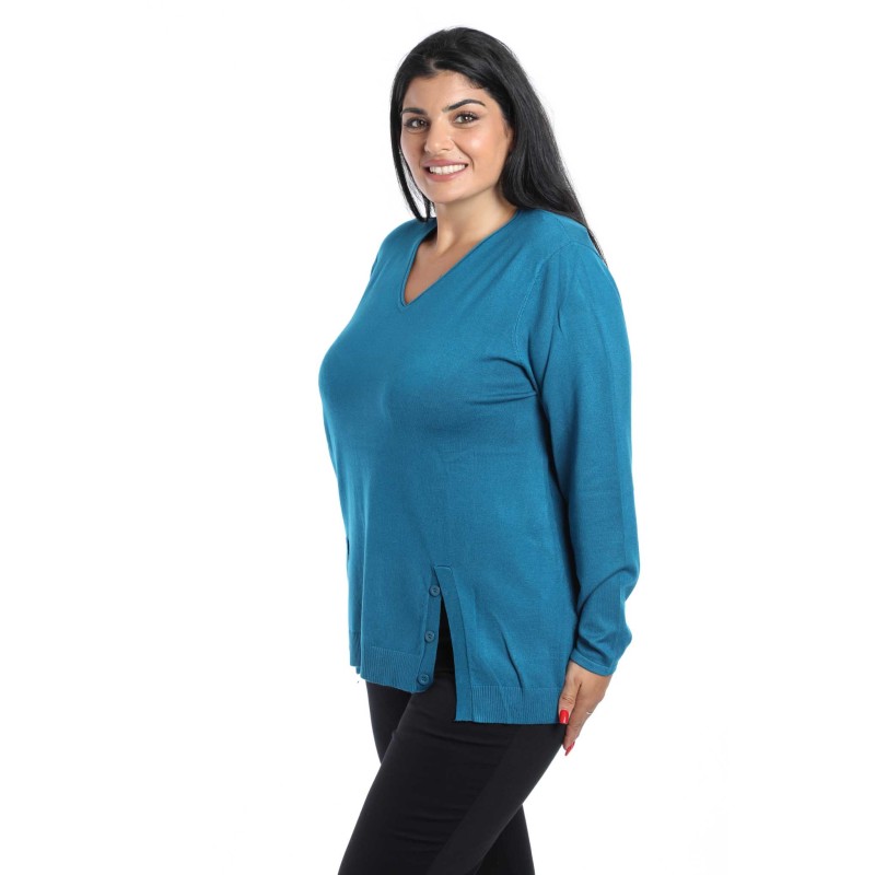 maglia curvy tinta unita scollo a v con fondo asimmetrico arricchito da spacchi e bottoni 70%viscosa 20% lana 10% spandex