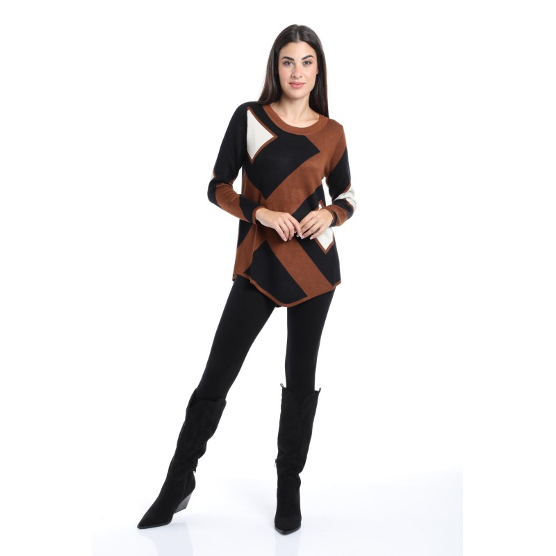 maglia girocollo con jaquard geometrico e fondo asimmetrico 70% viscosa 20% lana 10% spandex