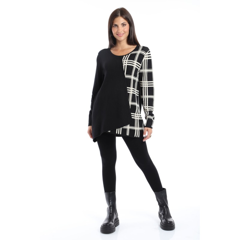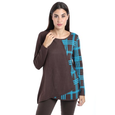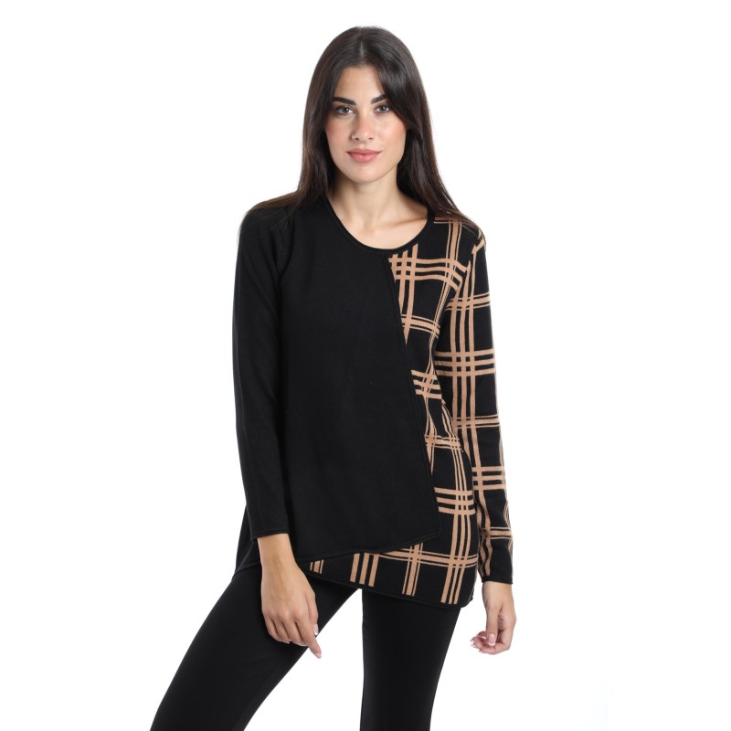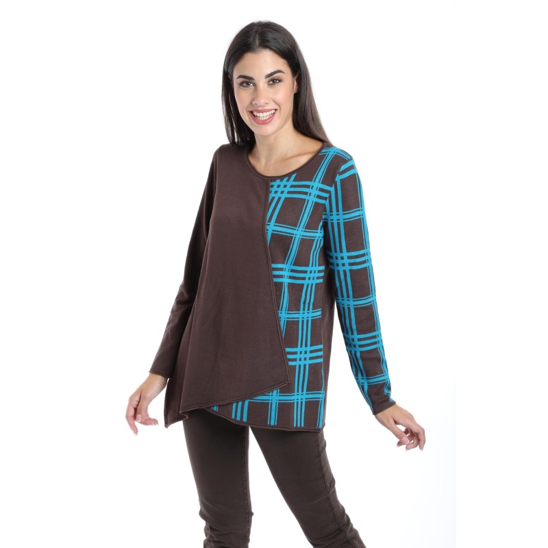 maglia girocollo con lavorazione jaquard geometrica fondo asimmetrico 70% viscosa 20% lana 10% spandex