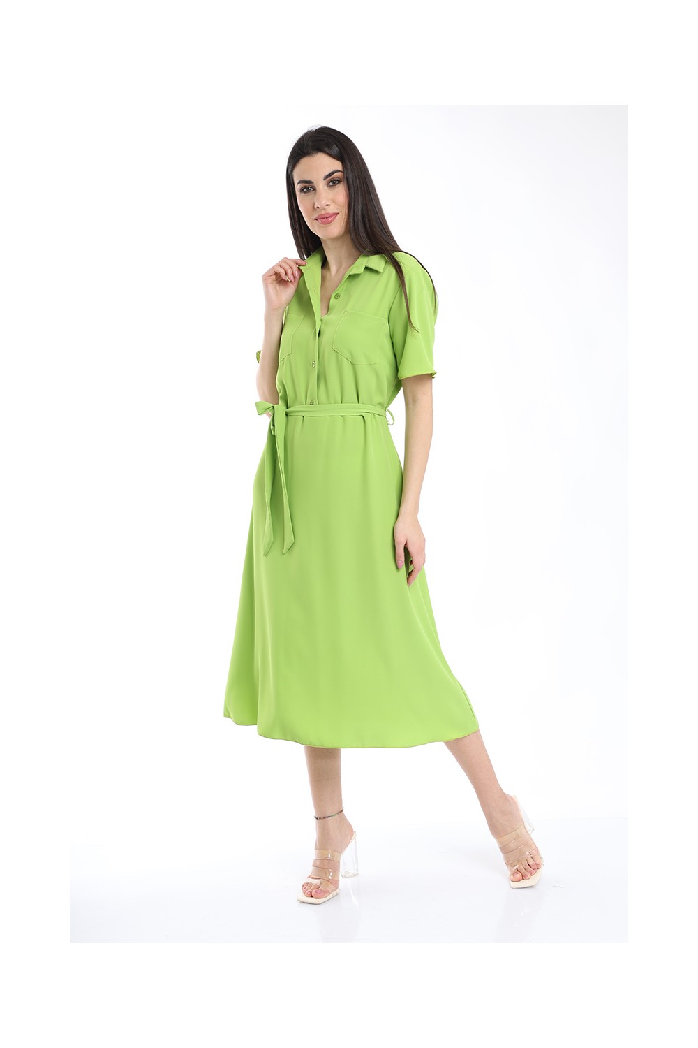 ABITO MEZZA MANICA, COLLO CAMICIA CON TASCHE E CINTA.