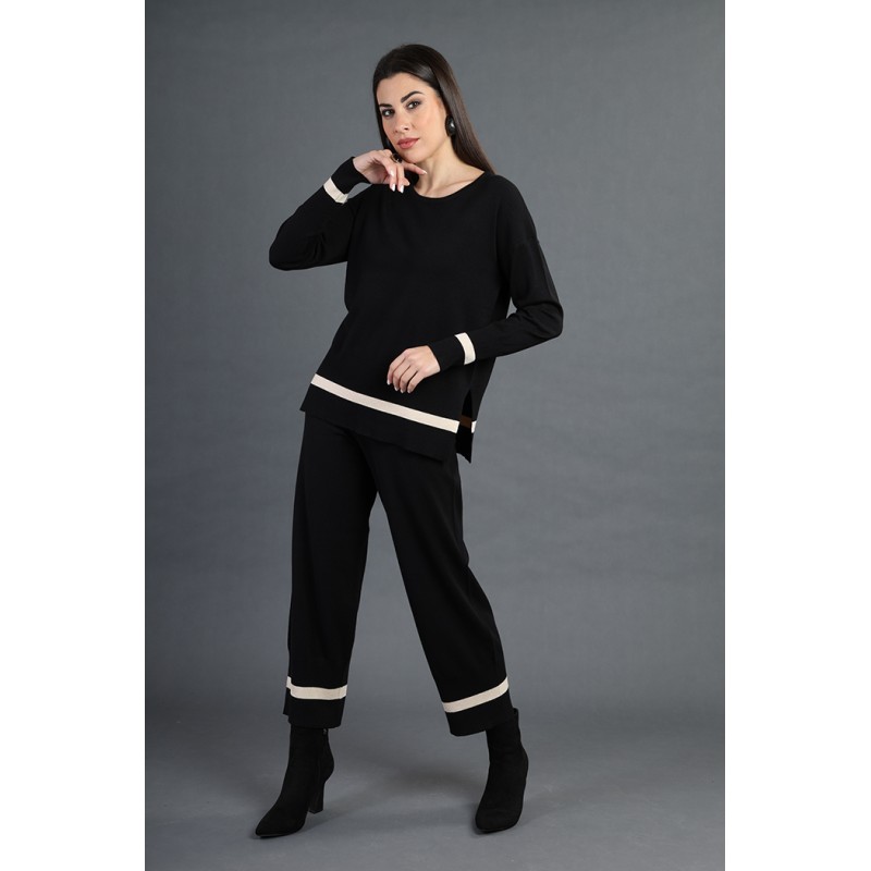 Scopri l'eleganza e il comfort con questo completo in maglia, perfetto per ogni occasione! Caratterizzato da una riga distintiva sul fondo e delicate balze sia sulla maglia che sui pantaloni, questo set è un vero must-have nel tuo guardaroba. Realizzato in un filato di alta qualità (70% viscosa, 20% lana, 10% elastan), offre una vestibilità morbida e adattabile grazie al pantalone con elastico in vita, assicurando il massimo comfort durante tutta la giornata.