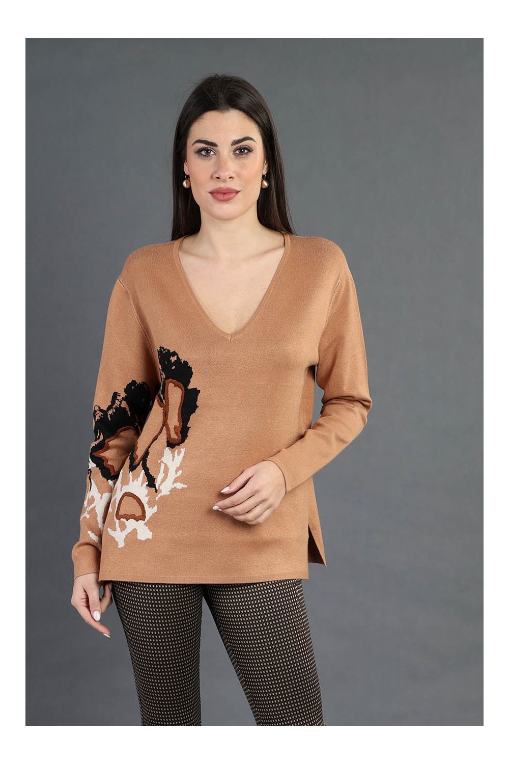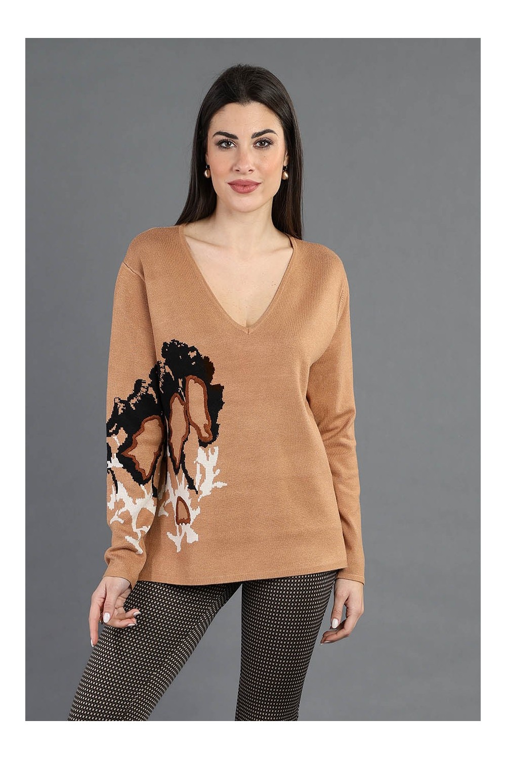 Scopri l'eleganza senza tempo con questa maglia scollo a V, perfetta per ogni occasione! Realizzata in un filato di alta qualità composto da 70% viscosa, 20% lana e 10% elastan, offre una vestibilità morbida e confortevole. Il raffinato design jacquard, arricchito da dettagli di ricamo, conferisce un tocco di originalità e stile a questo classico intramontabile.