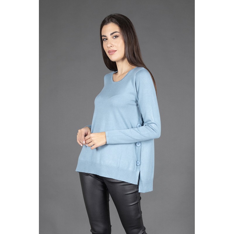 Scegli il perfetto mix di comfort e stile con questa maglia girocollo in misto lana. Realizzata con un filato di alta qualità composto al 70% da viscosa, 20% lana e 10% elastan, ti avvolgerà con morbidezza e leggerezza, mantenendo il calore giusto per ogni occasione. Il design a tinta unita è impreziosito da eleganti bottoni laterali e delicati spacchetti sul fondo, che donano un tocco di femminilità e movimento.