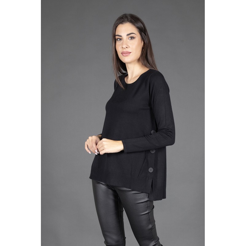 Scegli il perfetto mix di comfort e stile con questa maglia girocollo in misto lana. Realizzata con un filato di alta qualità composto al 70% da viscosa, 20% lana e 10% elastan, ti avvolgerà con morbidezza e leggerezza, mantenendo il calore giusto per ogni occasione. Il design a tinta unita è impreziosito da eleganti bottoni laterali e delicati spacchetti sul fondo, che donano un tocco di femminilità e movimento.