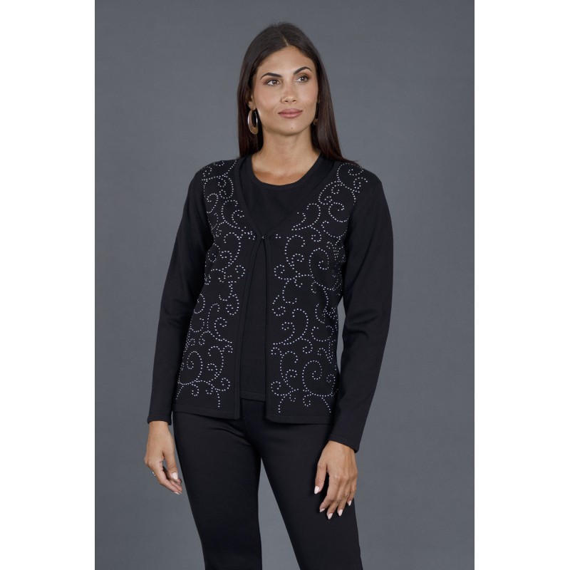 Aggiungi un tocco di raffinatezza al tuo guardaroba con il nostro twin set elegante, realizzato in un morbido e confortevole mix di 70% viscosa, 20% lana e 10% elastan. Le borchie applicate non solo arricchiscono il design, ma offrono anche un fascino unico che ti farà risaltare in ogni occasione.