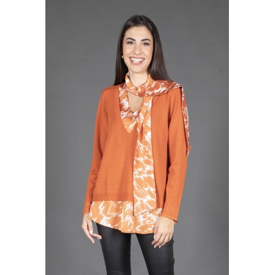 Rinnova il tuo guardaroba con la nostra maglia scollo a V, un capo elegante e versatile che unisce comfort e stile. Caratterizzata da una sciarpa abbinata e un fondo in tessuto effetto camicia, questa maglia è perfetta per creare look sofisticati e alla moda.