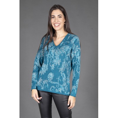 Rinnova il tuo stile con la nostra maglia scollo a V in jaquard con lurex. Questo capo è realizzato con un mix di alta qualità, composto da 70% viscosa, 20% lana e 10% spandex, che garantisce comfort e una vestibilità perfetta.
