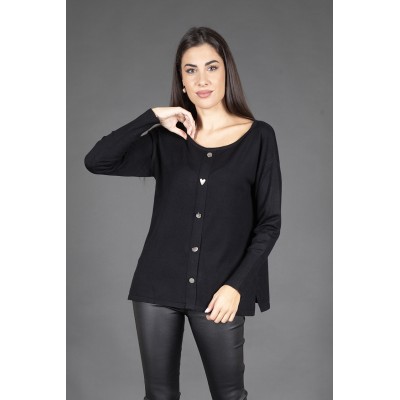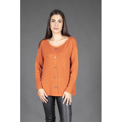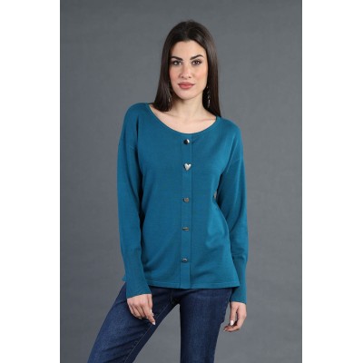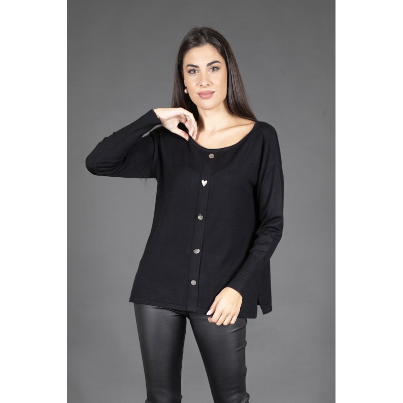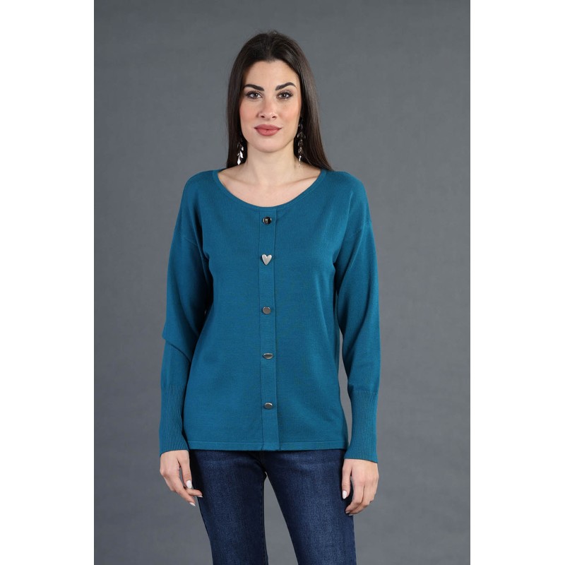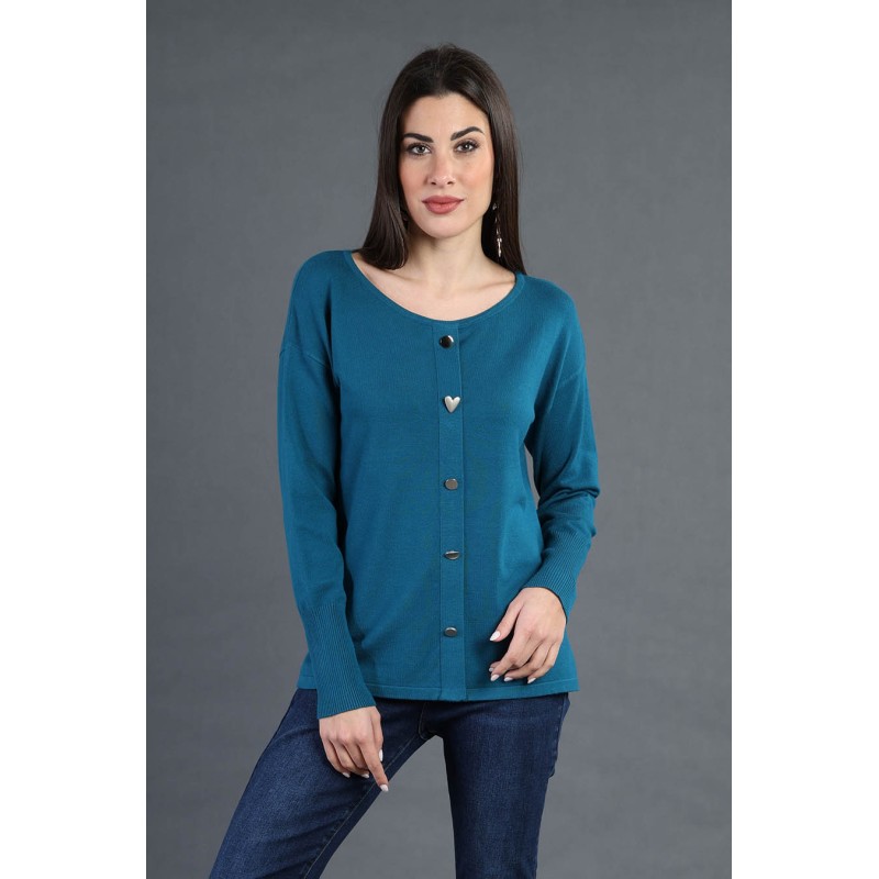 Aggiungi un tocco di stile al tuo guardaroba con questa maglia in misto lana morbida e confortevole 70% viscosa 20% lana 5% lurex 5% spandex, perfetta per affrontare le stagioni fredde. Il design si distingue per la chiusura frontale con bottoni metallici, impreziositi da un romantico bottone a forma di cuore, per un dettaglio femminile irresistibile. Gli spacchetti laterali sul fondo migliorano la vestibilità, aggiungendo movimento e comfort al capo.