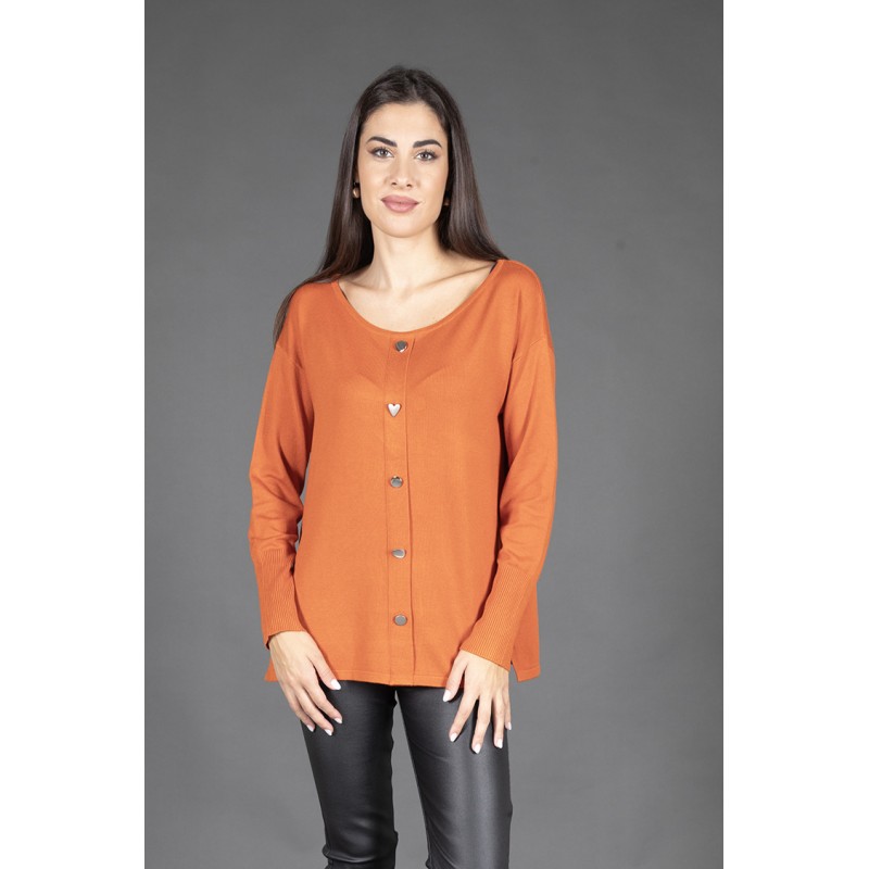 Aggiungi un tocco di stile al tuo guardaroba con questa maglia in misto lana morbida e confortevole 70% viscosa 20% lana 5% lurex 5% spandex, perfetta per affrontare le stagioni fredde. Il design si distingue per la chiusura frontale con bottoni metallici, impreziositi da un romantico bottone a forma di cuore, per un dettaglio femminile irresistibile. Gli spacchetti laterali sul fondo migliorano la vestibilità, aggiungendo movimento e comfort al capo.