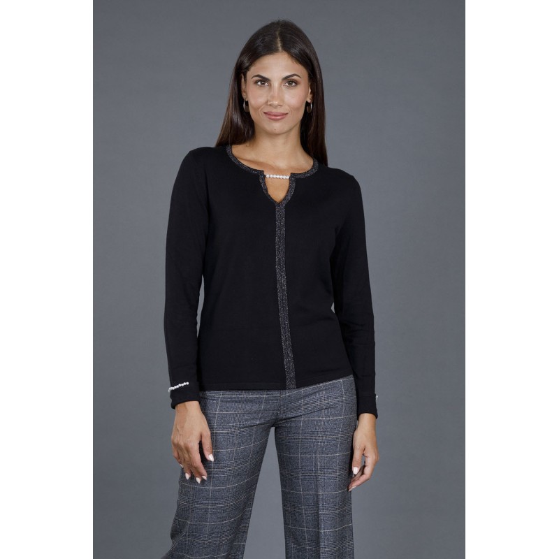 Aggiungi un tocco di classe al tuo guardaroba con la nostra maglia elegante! Caratterizzata da un scollo a V raffinato, è arricchita da lurex e perle ricamate che la rendono perfetta per ogni occasione speciale.