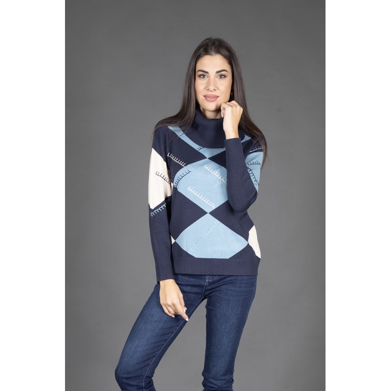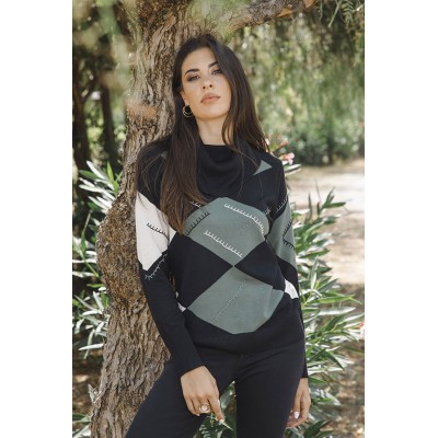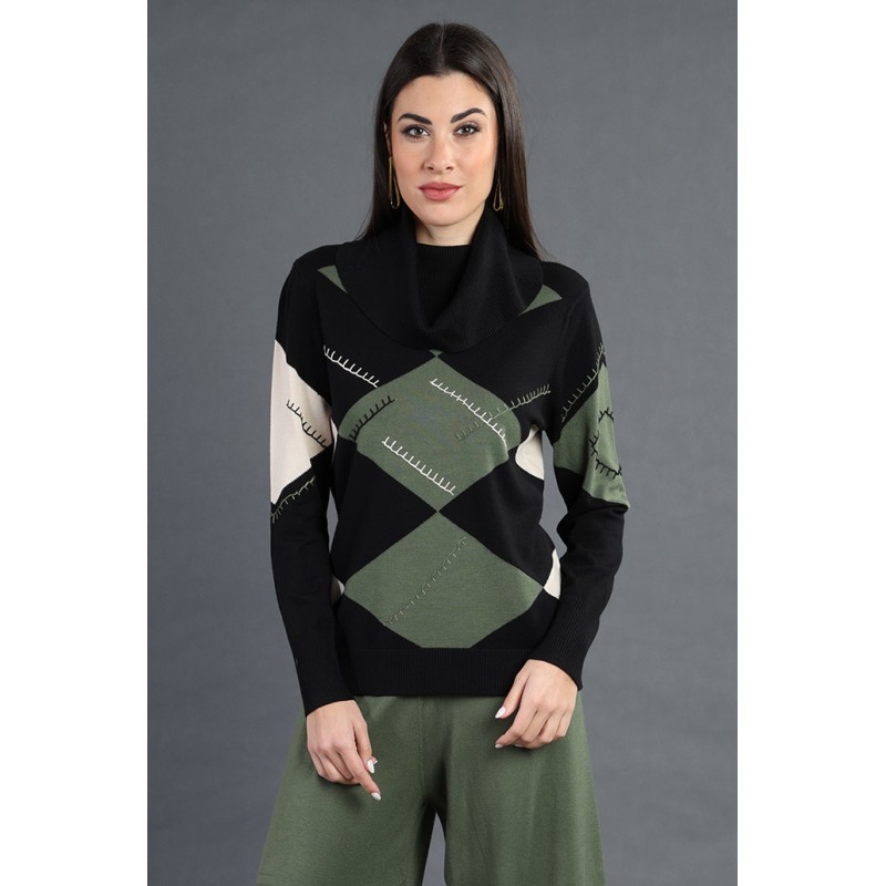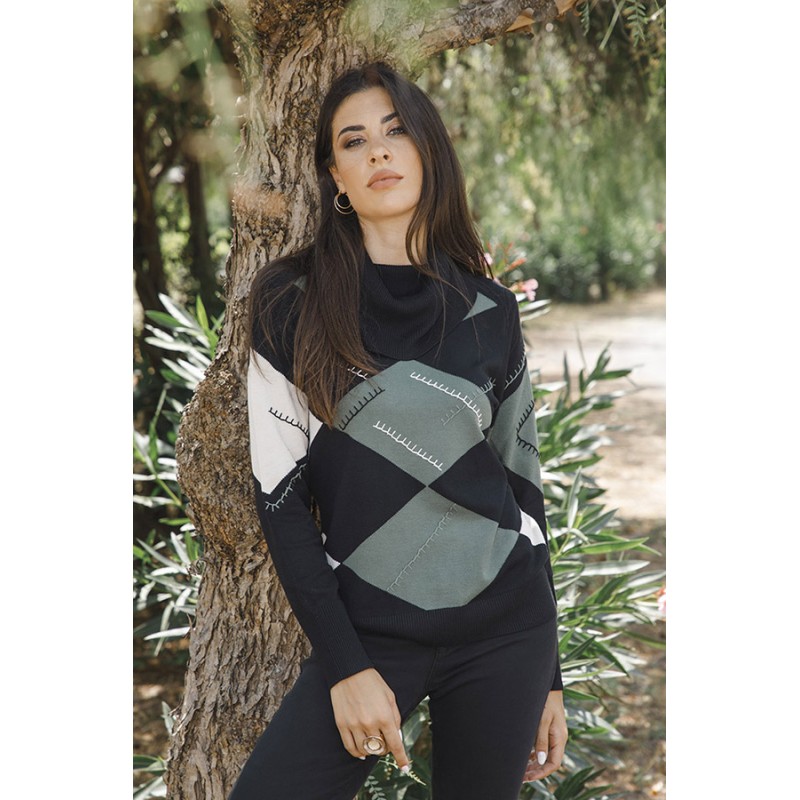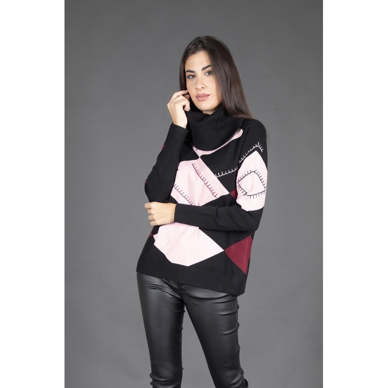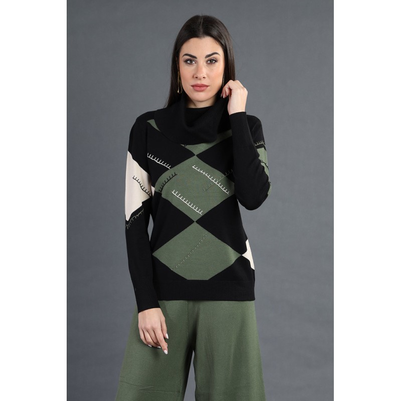 Scopri il perfetto equilibrio tra comfort e stile con il nostro dolcevita in misto lana. Realizzato con un pregiato mix di 70% viscosa, 20% lana e 10% elastan, questo maglione è arricchito da un sofisticato ricamo a filo che presenta dettagli geometrici in un raffinato motivo a rombi. Le cuciture decorative creano un effetto patchwork elegante e moderno.