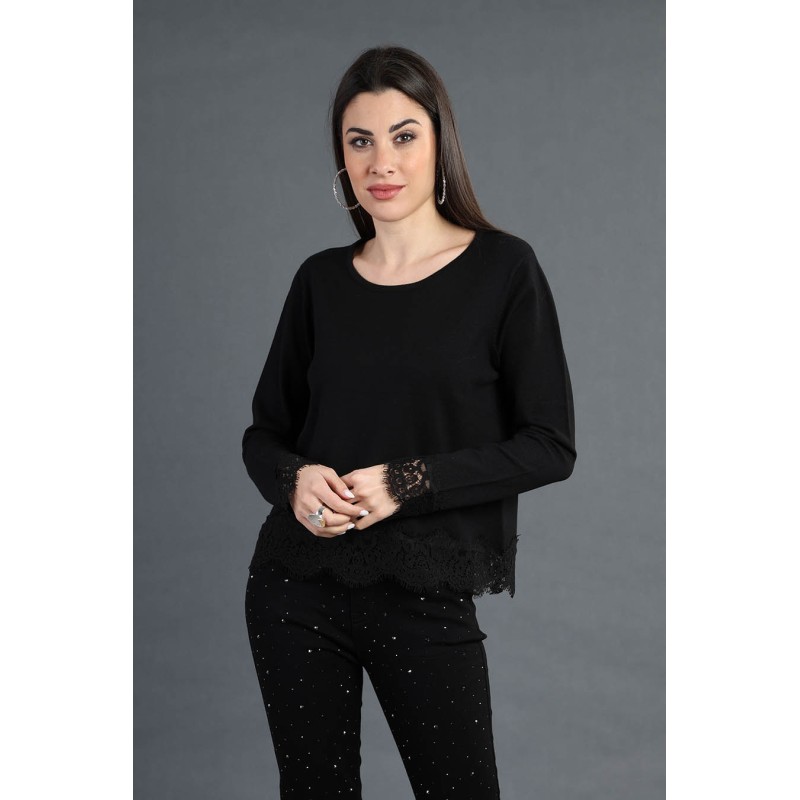 Aggiungi un tocco di femminilità al tuo guardaroba con la nostra maglia girocollo, decorata con eleganti dettagli in pizzo sui polsi e sulla balza. Realizzata in un pregiato mix di filati (70% viscosa, 20% lana, 10% elastan), offre una vestibilità morbida e confortevole, perfetta per le giornate più fresche.