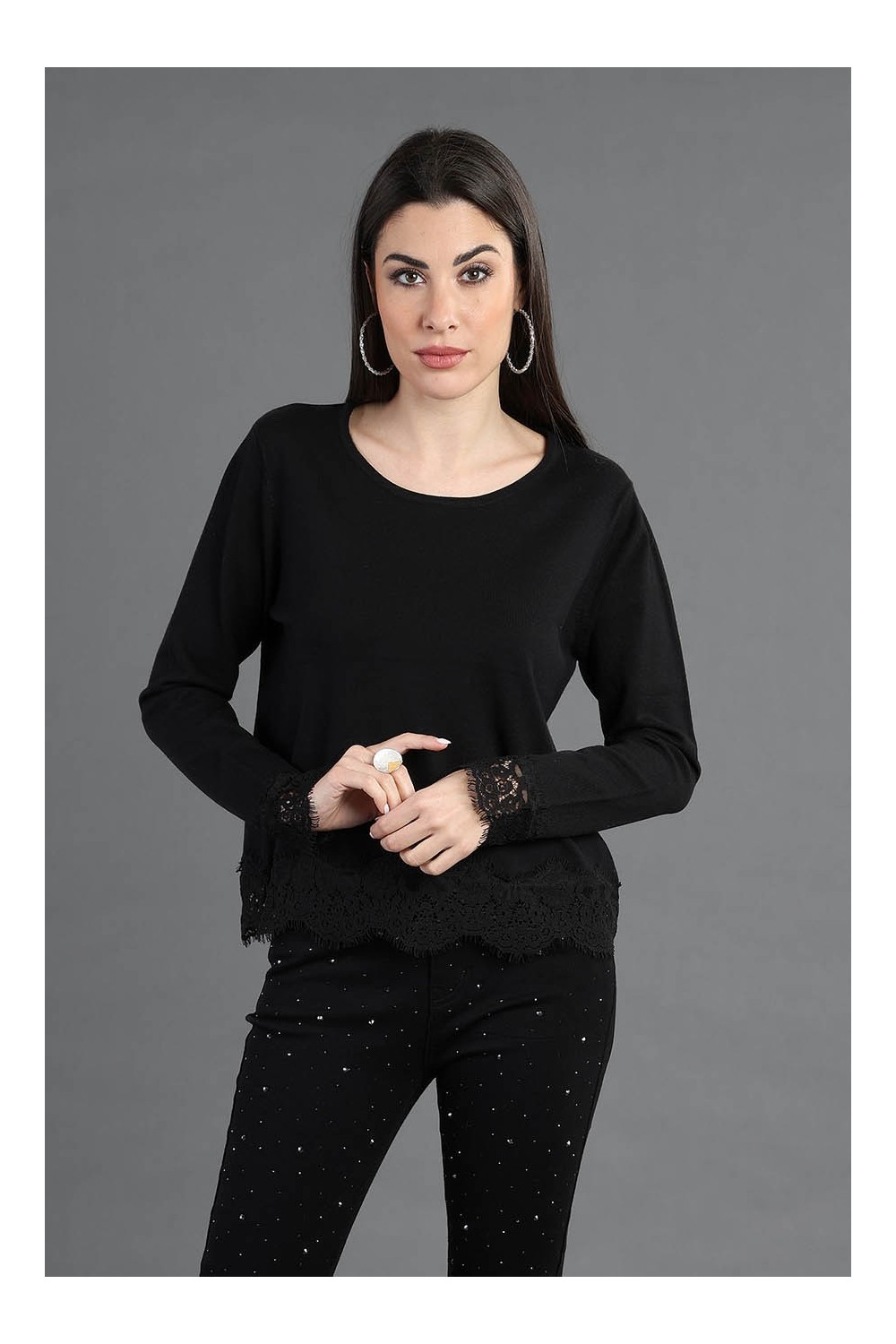 Aggiungi un tocco di femminilità al tuo guardaroba con la nostra maglia girocollo, decorata con eleganti dettagli in pizzo sui polsi e sulla balza. Realizzata in un pregiato mix di filati (70% viscosa, 20% lana, 10% elastan), offre una vestibilità morbida e confortevole, perfetta per le giornate più fresche.