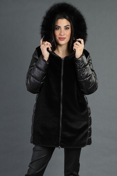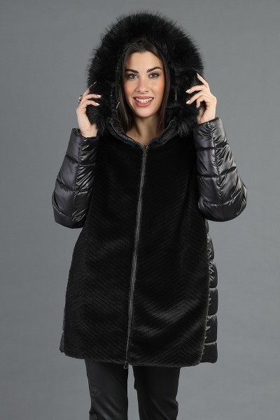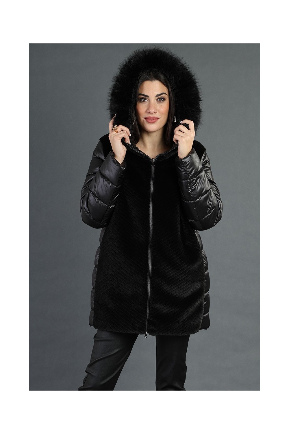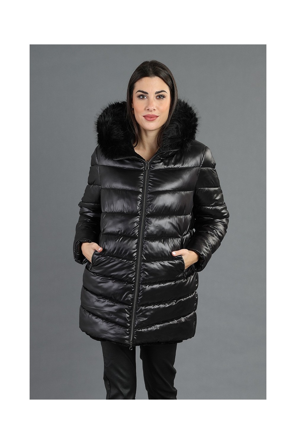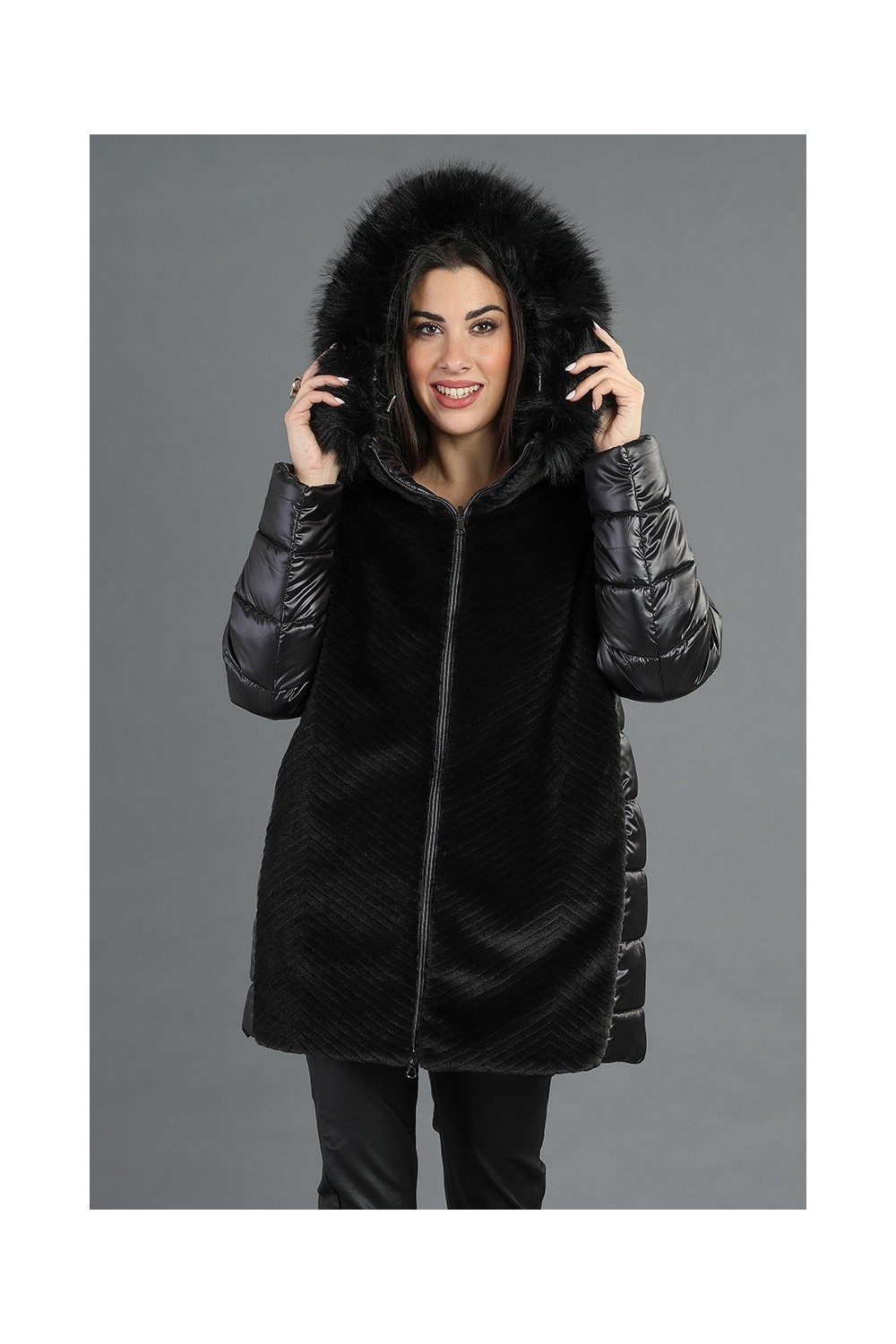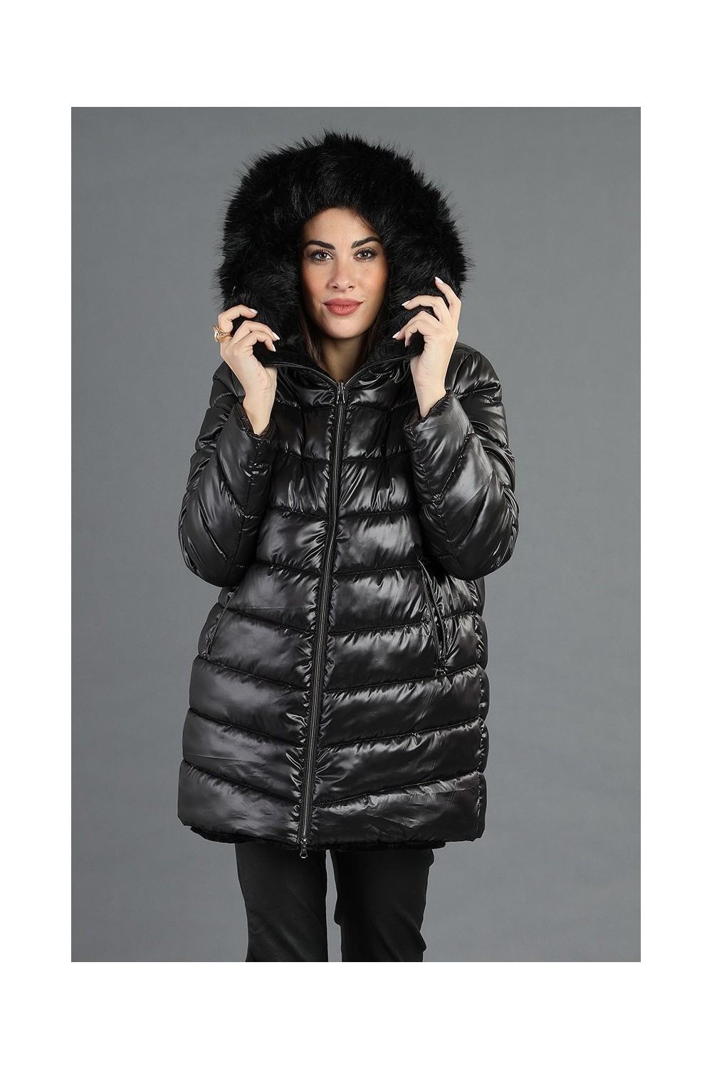 Scopri il nostro giubbotto reversibile ( 100% poliestere) che unisce eleganza e funzionalità! Con chiusura frontale a zip, questo capo è arricchito da profili in ecopelliccia e un collo removibile in ecopelliccia, perfetto per un tocco di classe.