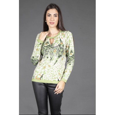 La fantasia animalier, caratterizzata da un gioco di colori e dettagli vivaci, conferisce alla maglia un aspetto moderno e accattivante. Un particolare distintivo è la goccia lungo lo scollo girocollo, che aggiunge un tocco di femminilità e sensualità, rendendo il capo perfetto sia per occasioni casual che per eventi informali dove è richiesto un look ricercato.