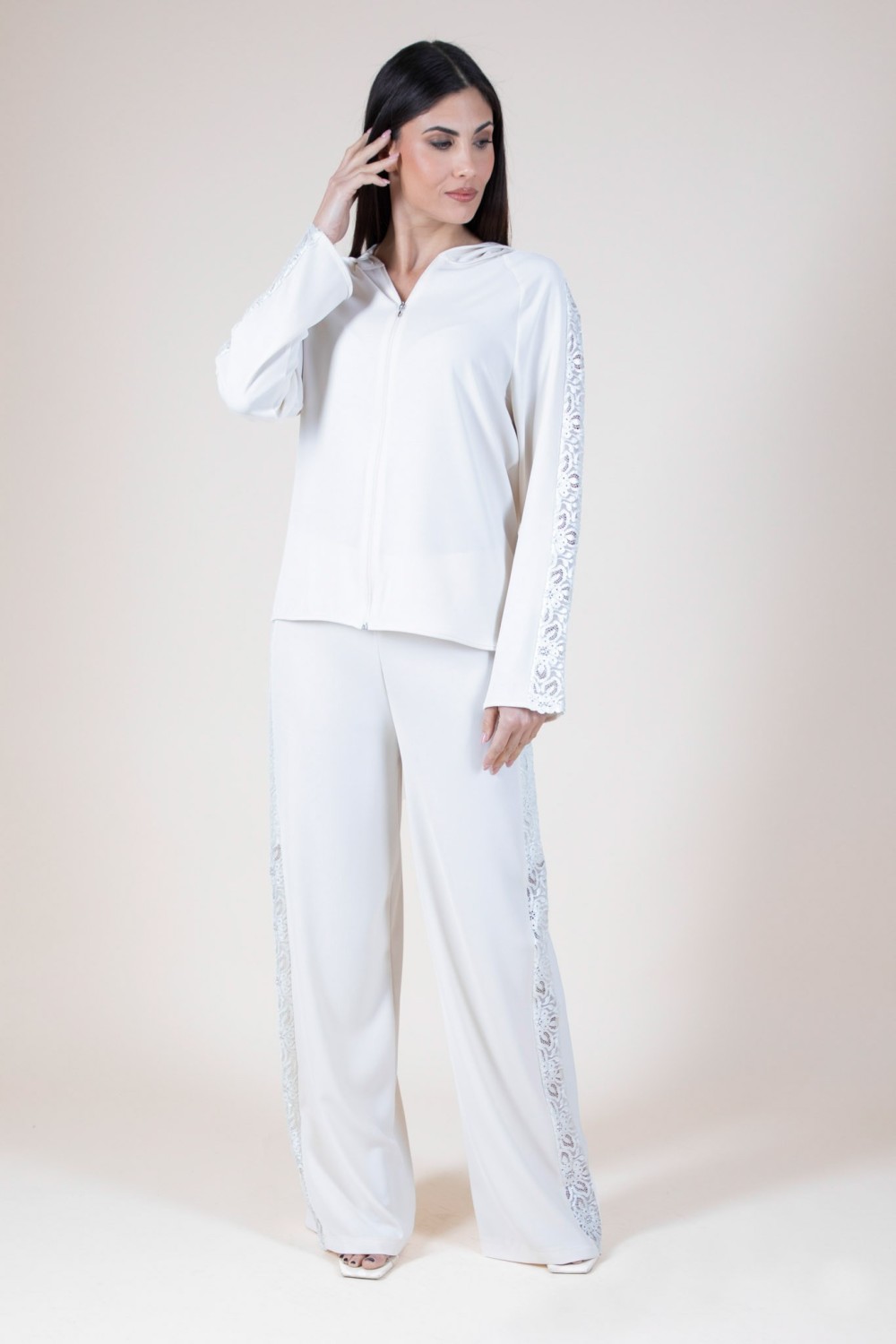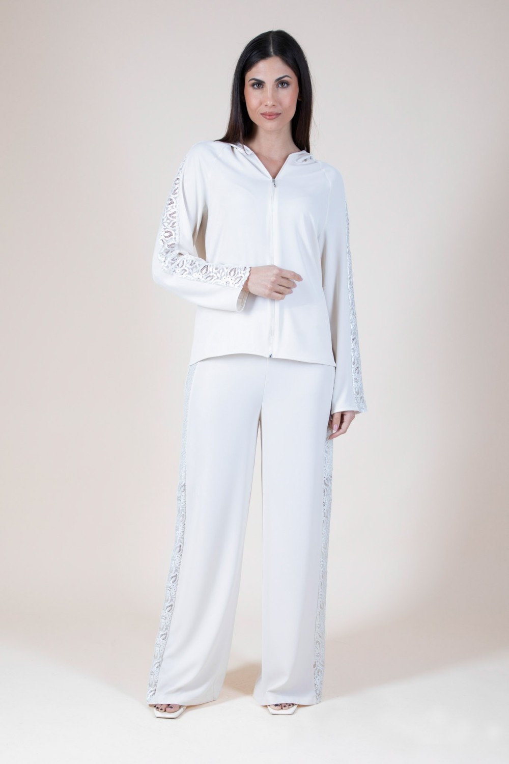 Scopri il perfetto equilibrio tra comfort e stile con questa felpa in tessuto fluido. Caratterizzata da un cappuccio pratico e una chiusura con zip, questa felpa si distingue per il raffinato pizzo placcato sulle maniche, un dettaglio elegante che aggiunge un tocco di originalità al tuo look. Il tessuto morbido e leggero ti garantisce una sensazione di benessere durante tutta la giornata, mentre la silhouette moderna e versatile la rende perfetta per ogni occasione, dal tempo libero alle uscite più casual chic.