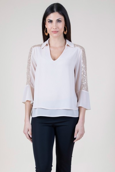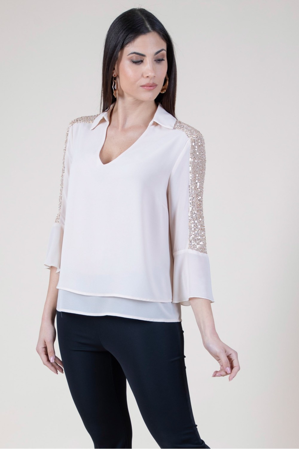 Aggiungi un tocco di brillantezza al tuo guardaroba con questa casacca scollo a V, elegante e sofisticata. Le maniche 3/4 a trombetta donano un look raffinato, mentre le paillettes impreziosiscono il capo con un tocco di luce che non passerà inosservato. Realizzata con materiali di alta qualità, questa casacca è perfetta per ogni occasione, dalla giornata in ufficio alla serata elegante. Versatile e chic, si abbina facilmente a jeans, pantaloni o gonne. Non perdere l'opportunità di brillare! Acquistala ora e porta il tuo stile a un nuovo livello! 100% poliestere