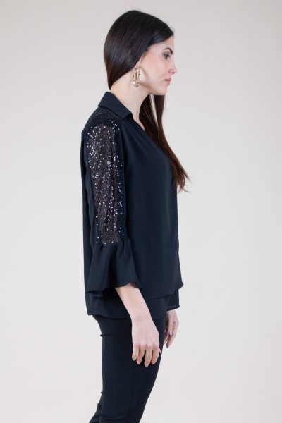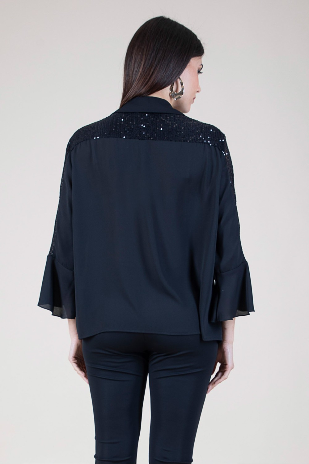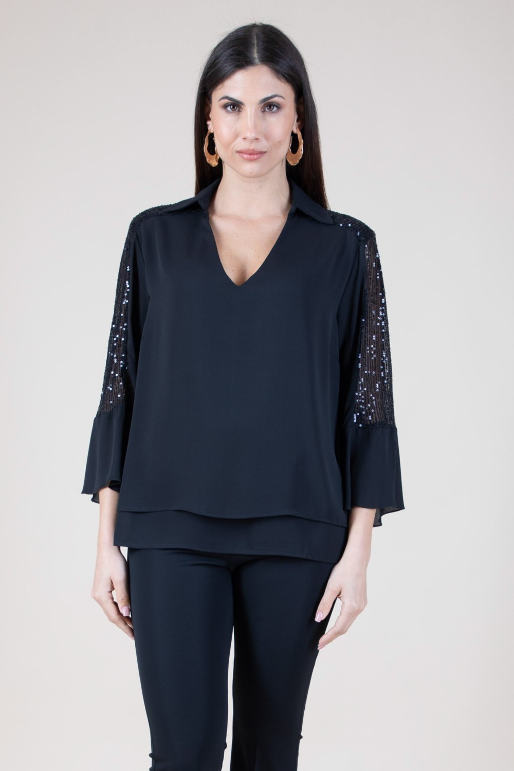 Aggiungi un tocco di brillantezza al tuo guardaroba con questa casacca scollo a V, elegante e sofisticata. Le maniche 3/4 a trombetta donano un look raffinato, mentre le paillettes impreziosiscono il capo con un tocco di luce che non passerà inosservato. Realizzata con materiali di alta qualità, questa casacca è perfetta per ogni occasione, dalla giornata in ufficio alla serata elegante. Versatile e chic, si abbina facilmente a jeans, pantaloni o gonne. Non perdere l'opportunità di brillare! Acquistala ora e porta il tuo stile a un nuovo livello! 100% poliestere