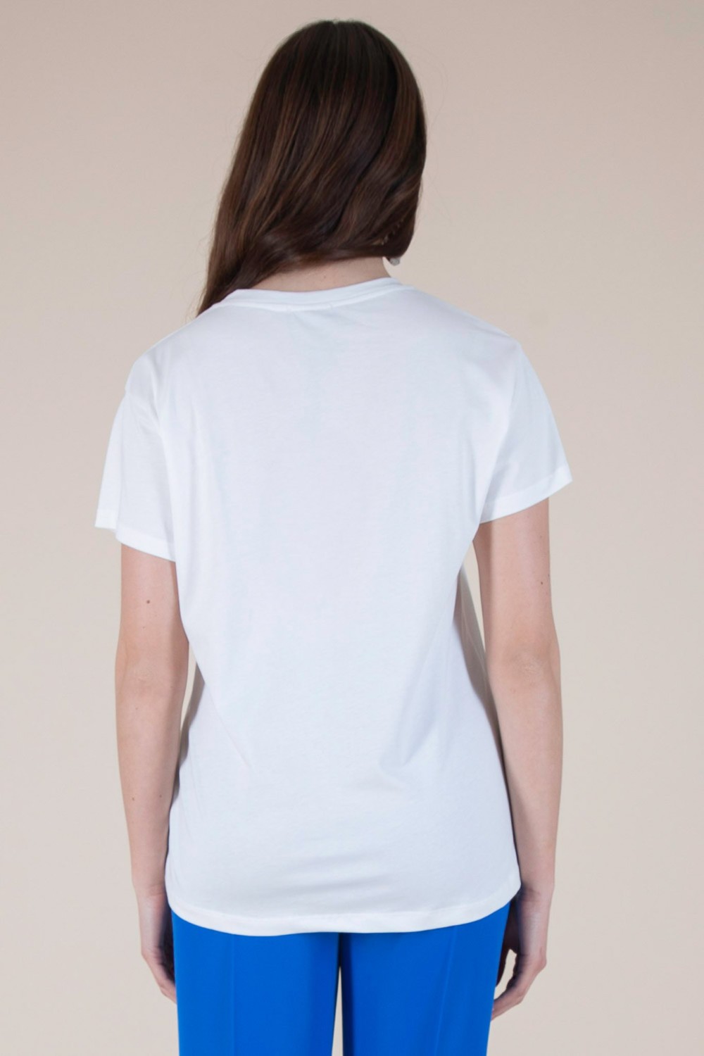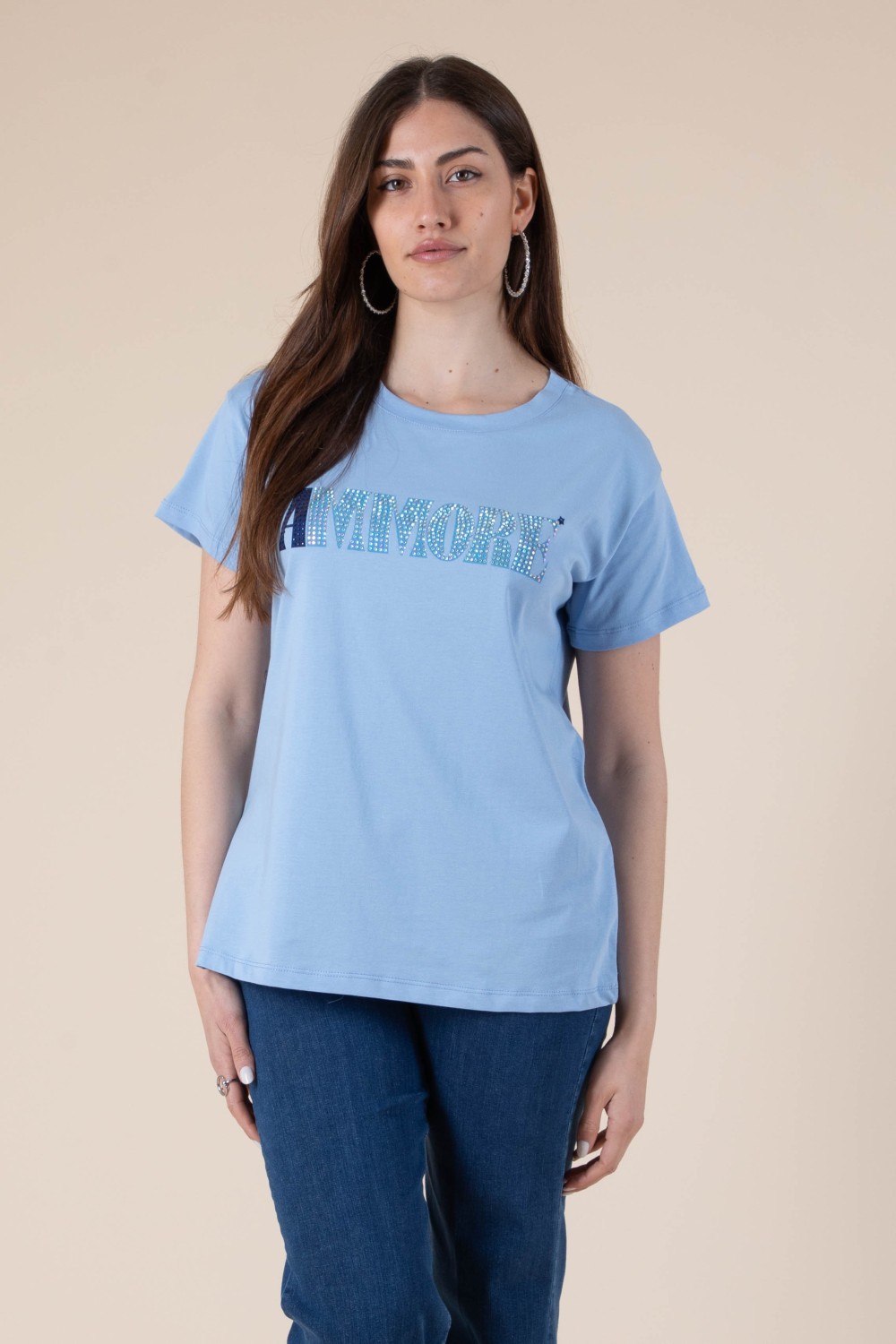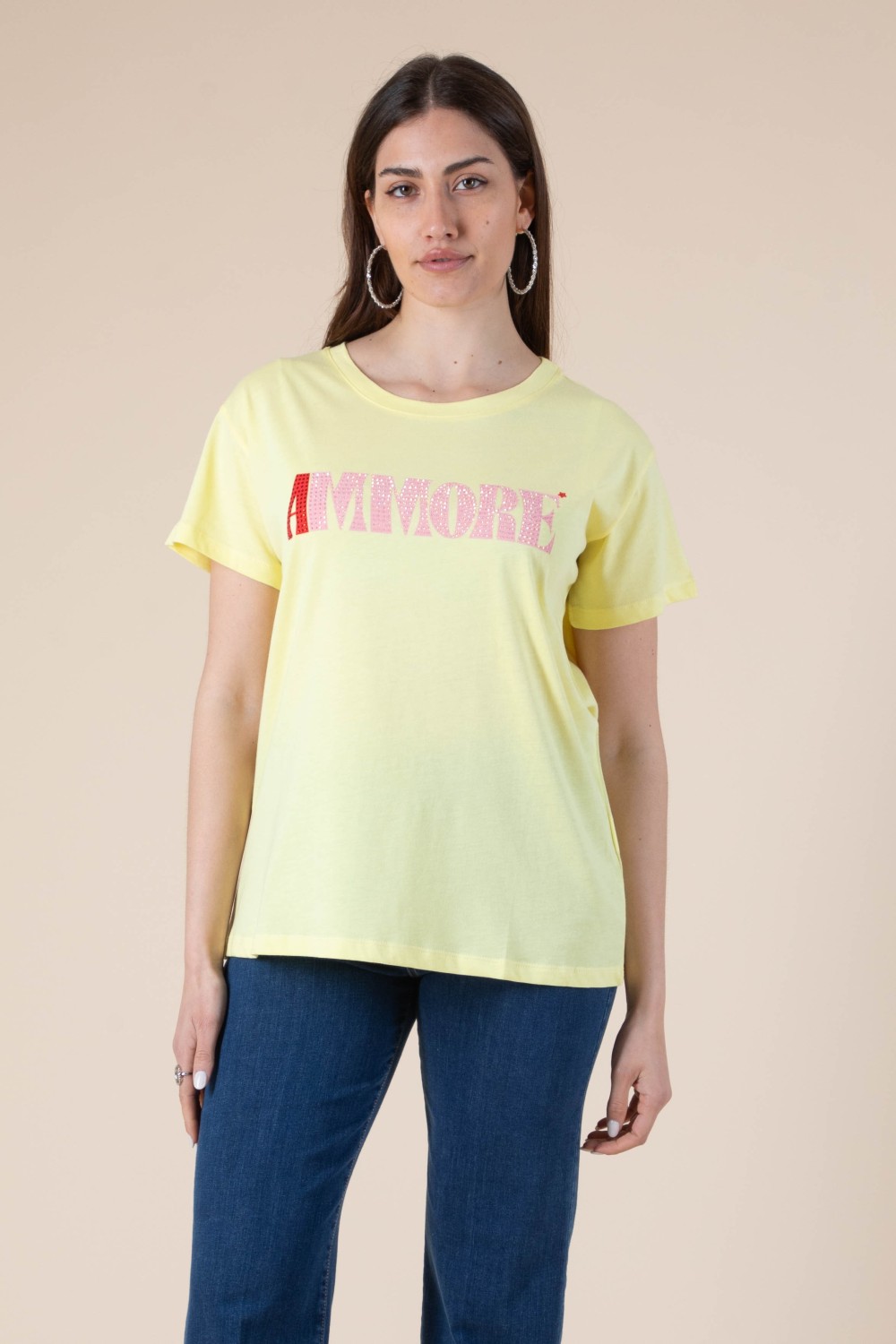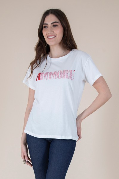 Porta un messaggio dâamore ovunque tu vada con la nostra t-shirt "Ammore", perfetta per uno stile casual ma ricco di carattere. Realizzata in morbido cotone, questa maglietta a manica corta con scollo tondo si distingue per la scritta "AMMORE" arricchita da strass che aggiungono un tocco vivace e originale al tuo outfit.