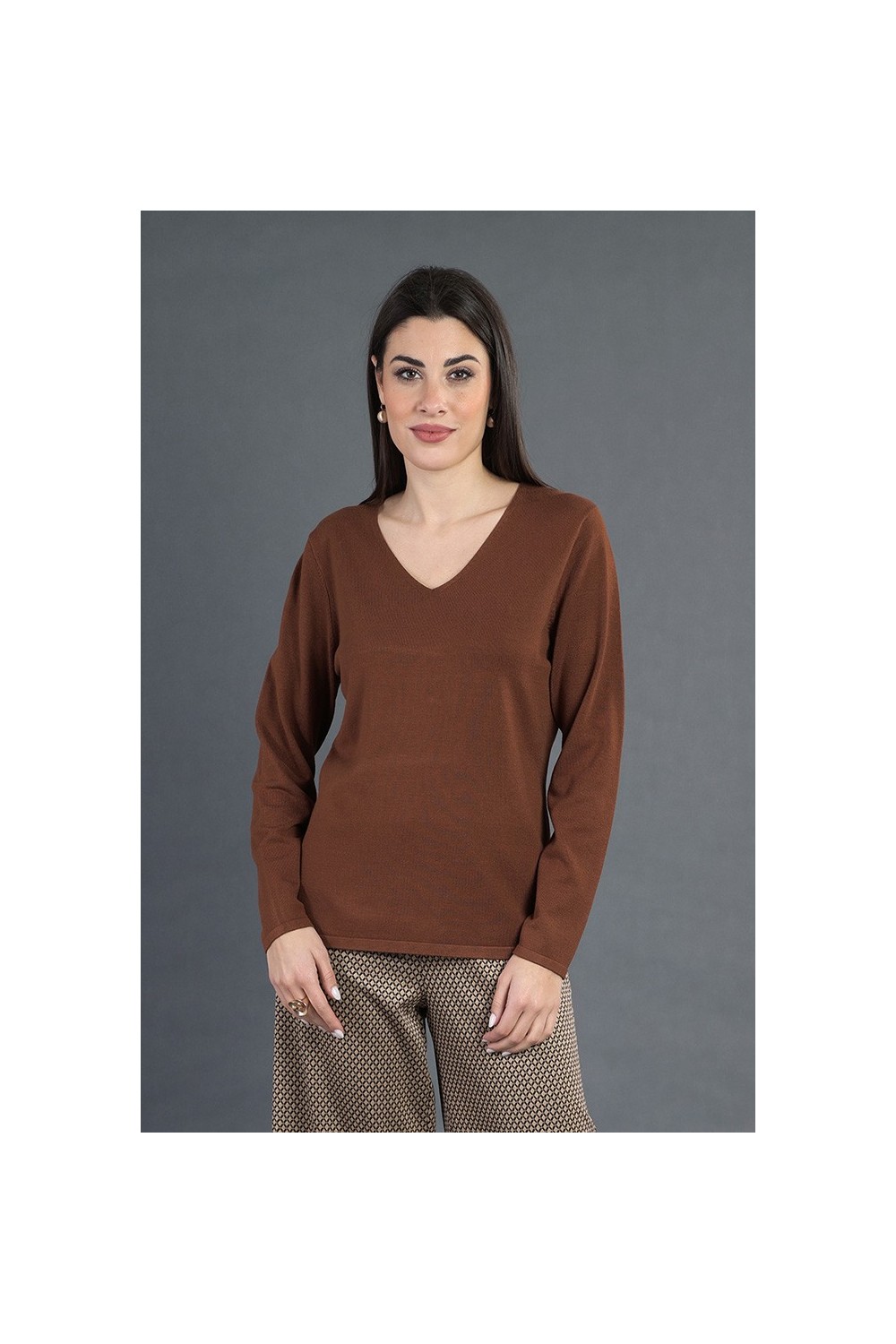 Maglia basica con scollo a V, un capo intramontabile pensato per accompagnarti con stile in ogni momento della giornata. Il design semplice ma curato valorizza la silhouette, mentre lo scollo a V dona un tocco femminile e raffinato. Perfetta da sola o sotto giacche e cardigan, è un must-have da avere sempre a portata di mano. Aggiungila al tuo look quotidiano per un'eleganza senza sforzo! 70% viscosa 20% lana 10% elastan